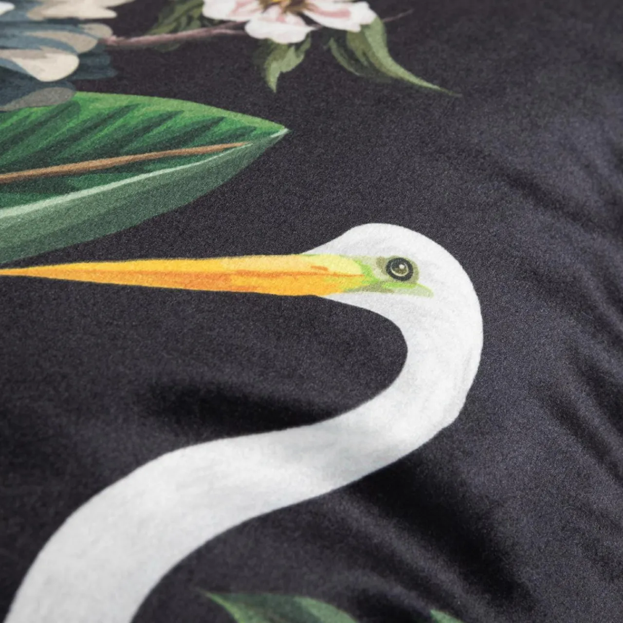 Ozdobna poszewka COLINA o czarnym kolorze z przyrodniczym motywem białych kwiatów i ptaków podkreśli wnętrze w stylu romantycznym.