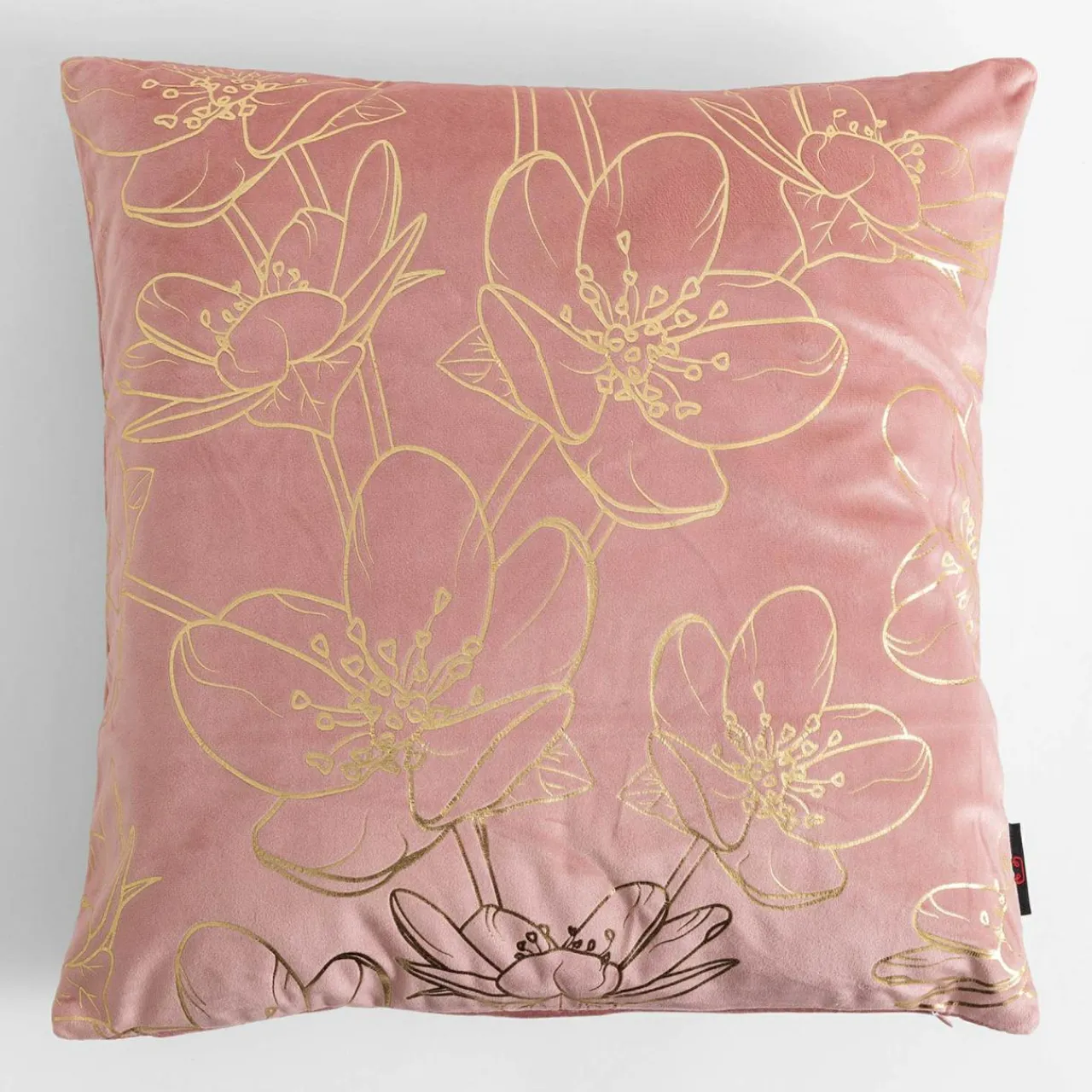 Poszewka welurowa CASILA o różowym kolorze przykuje Twoją uwagę złotym, kwiatowym wzorem.