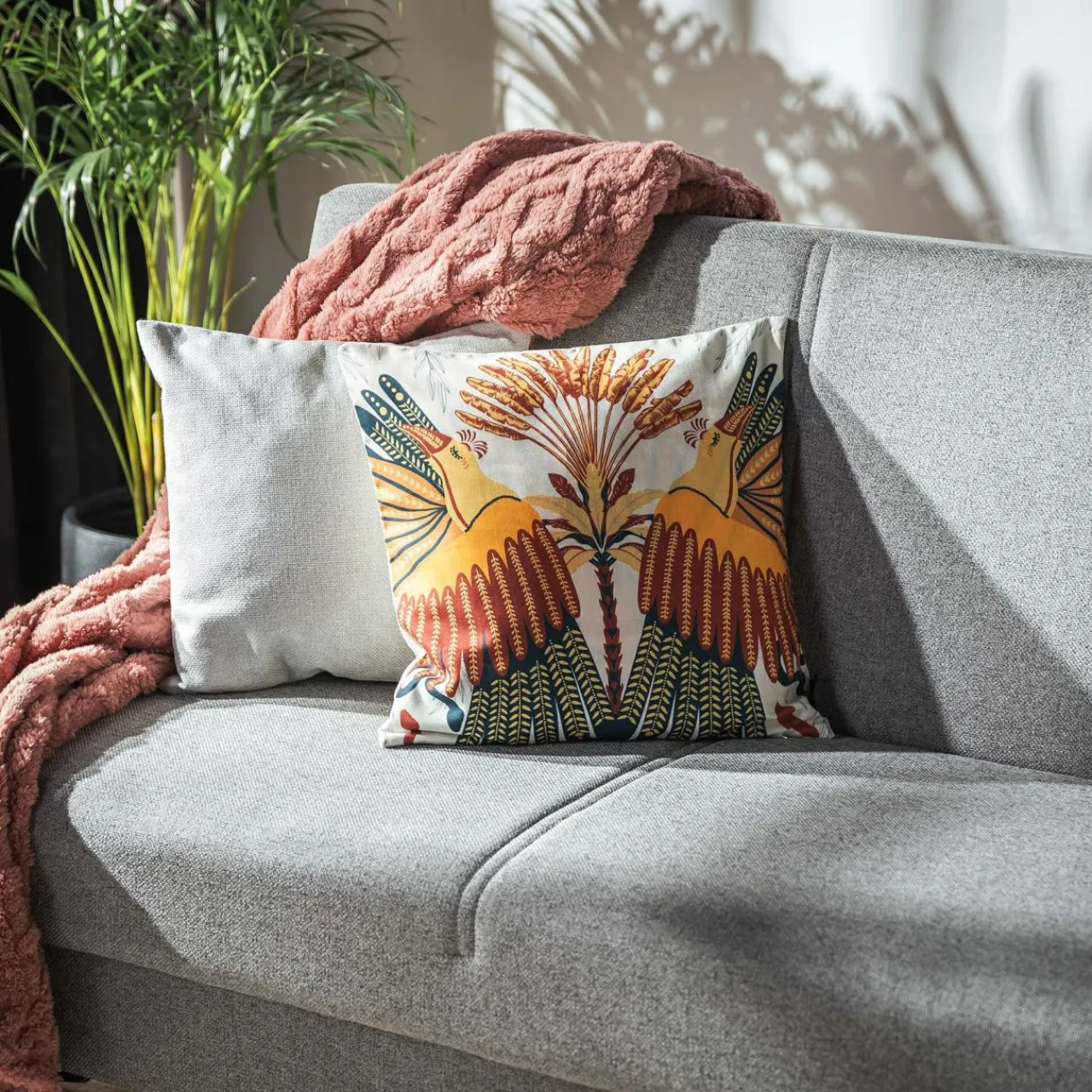 - Barwny wzór z dwoma egzotycznymi ptakami jest jednostronny. Z tyłu poszewki jednolita biel pozwala odmienić wystrój w dowolnej chwili.
