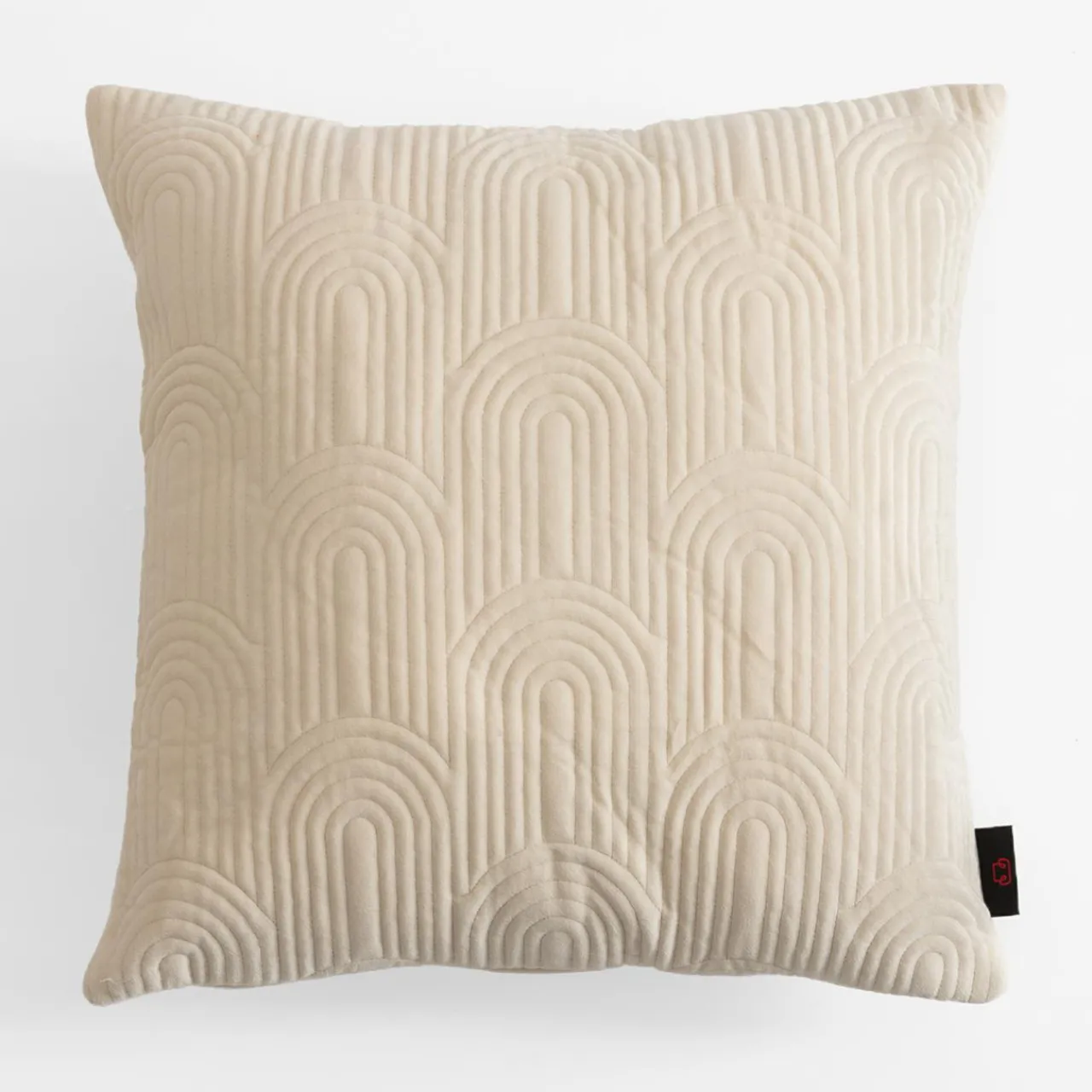 Kremowa poszewka JONES wyróżnia się ozdobnym geometrycznym wzorem. Wpisze się w skandynawski wystrój na tle szarej sofy i białych ścian.
