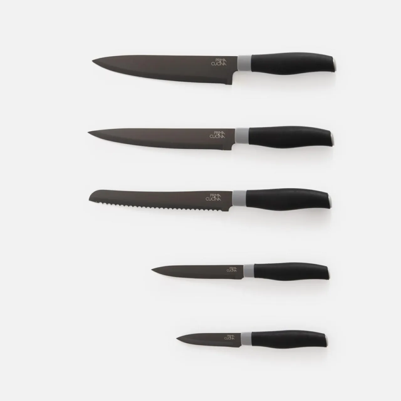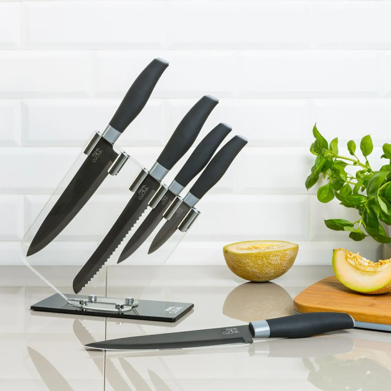 Komplet pięciu profesjonalnych noży w nowoczesnym bloku z przezroczystego akrylu to praktyczny i niezastąpiony element wyposażenia każdej kuchni. Noże wykonane są ze szlachetnej stali nierdzewnej i posiadają powłokę tytanową, odporną na zarysowania, dzięki której krojenie potraw będzie o wiele łatwiejsze i przyjemniejsze. Po każdym użyciu zaleca się mycie za pomocą miękkiej gąbki. W skład zestawu wchodzi: