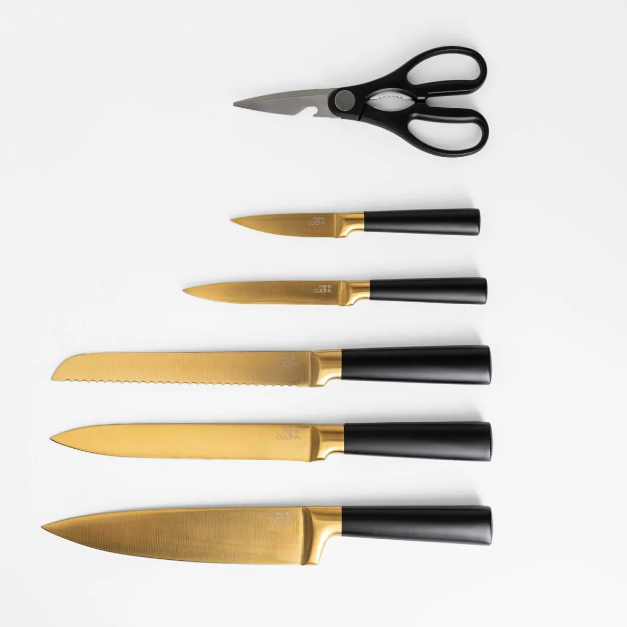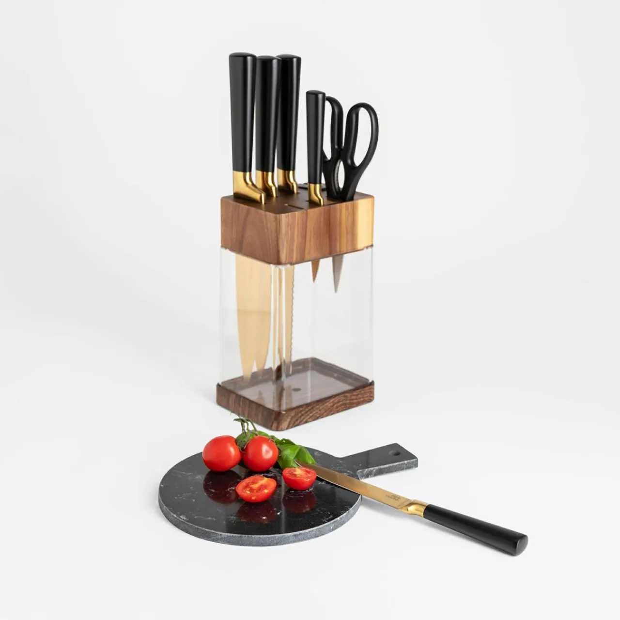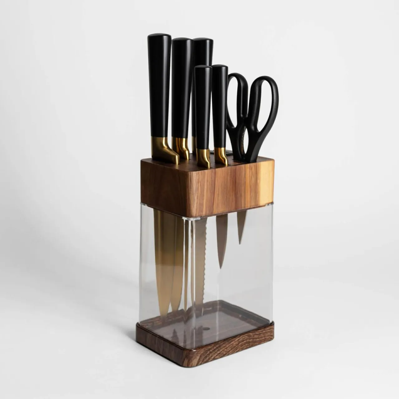 Zestaw noży COMO to funkcjonalne i stylowe rozwiązanie do nowoczesnej kuchni. Złote ostrza trzymane w pojemniku z przezroczystą zabudową są widoczne, przyciągając uwagę.