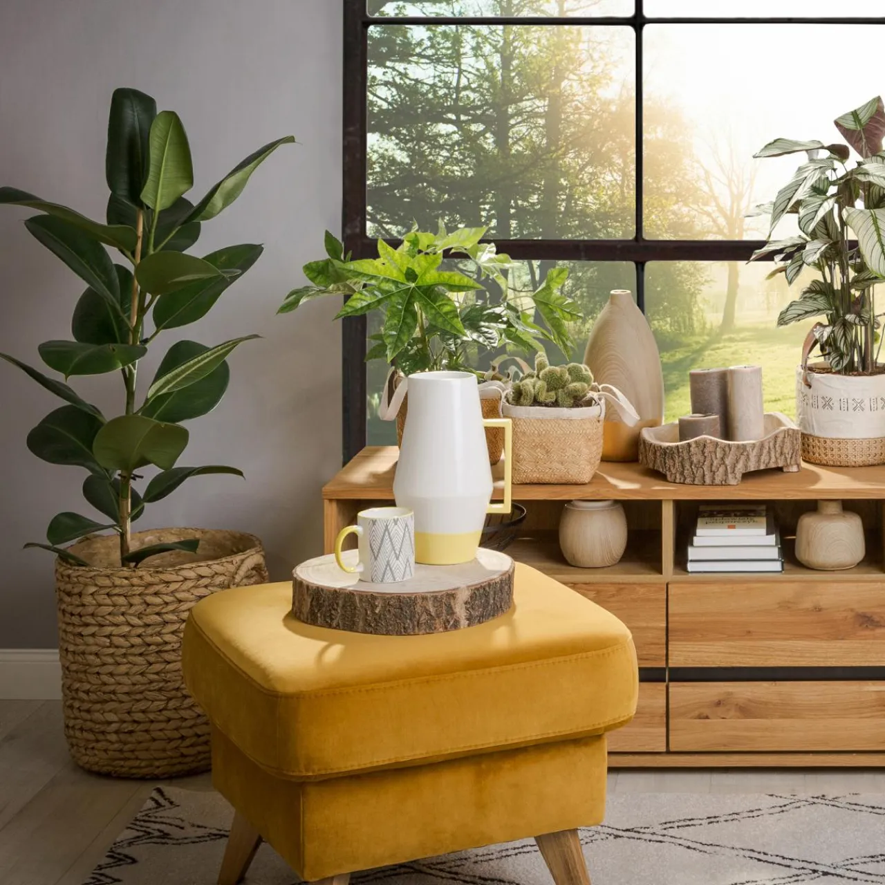 Musztardowa barwa dobrze prezentuje się w zestawieniu z butelkową zielenią, brązami i granatem. Pufa o tej barwie zdecydowanie ożywia monochromatyczne wnętrza.