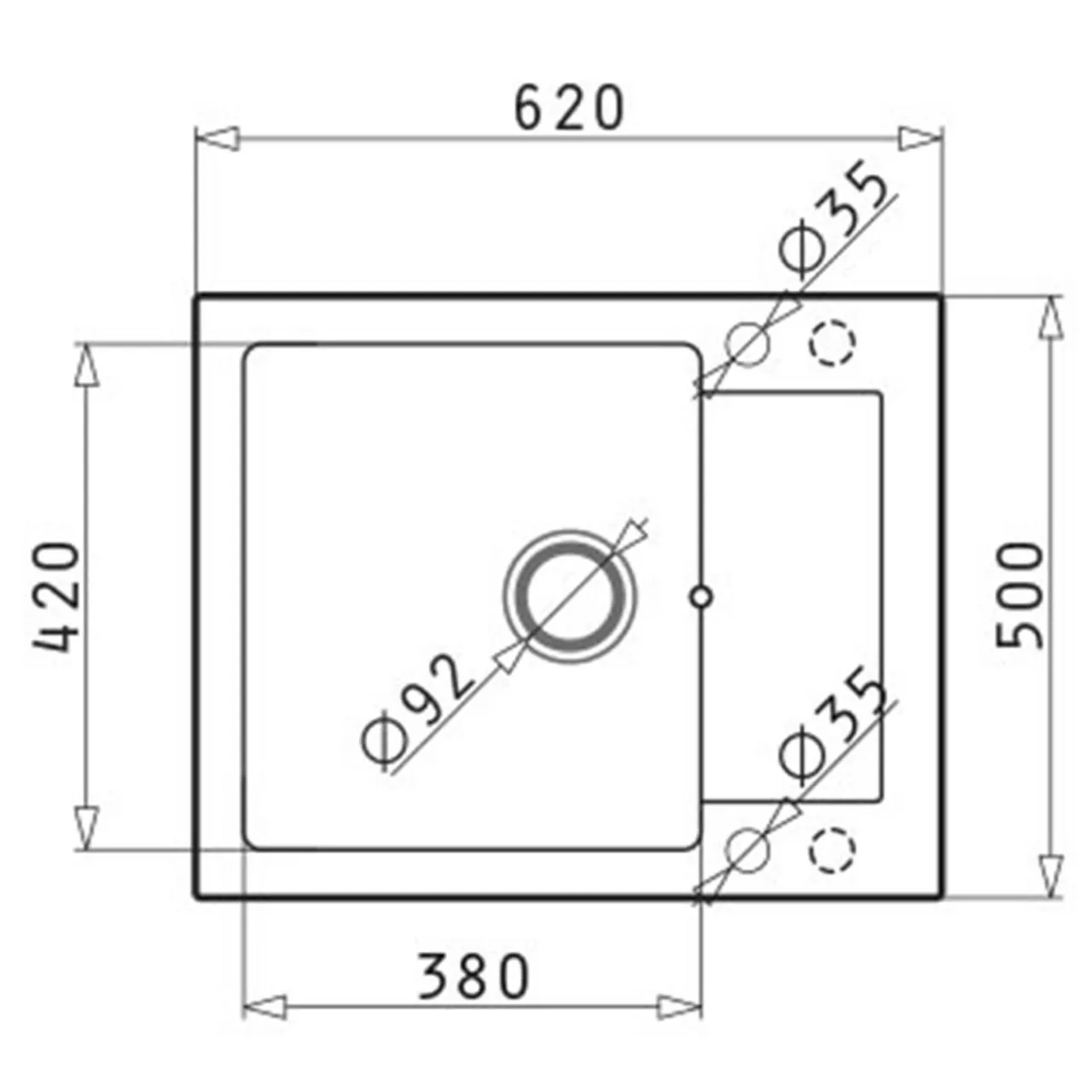 Zlewozmywak ZEFIR z krótkim ociekaczem został stworzony w technologii Pyragranit. Charakteryzuje się wysoką odpornością na uderzenia, zarysowania i oddziaływanie wysokich i niskich temperatur. Wymiary 62×50 cm sprawiają, że można go dopasować do szafki o szerokości 50 cm.