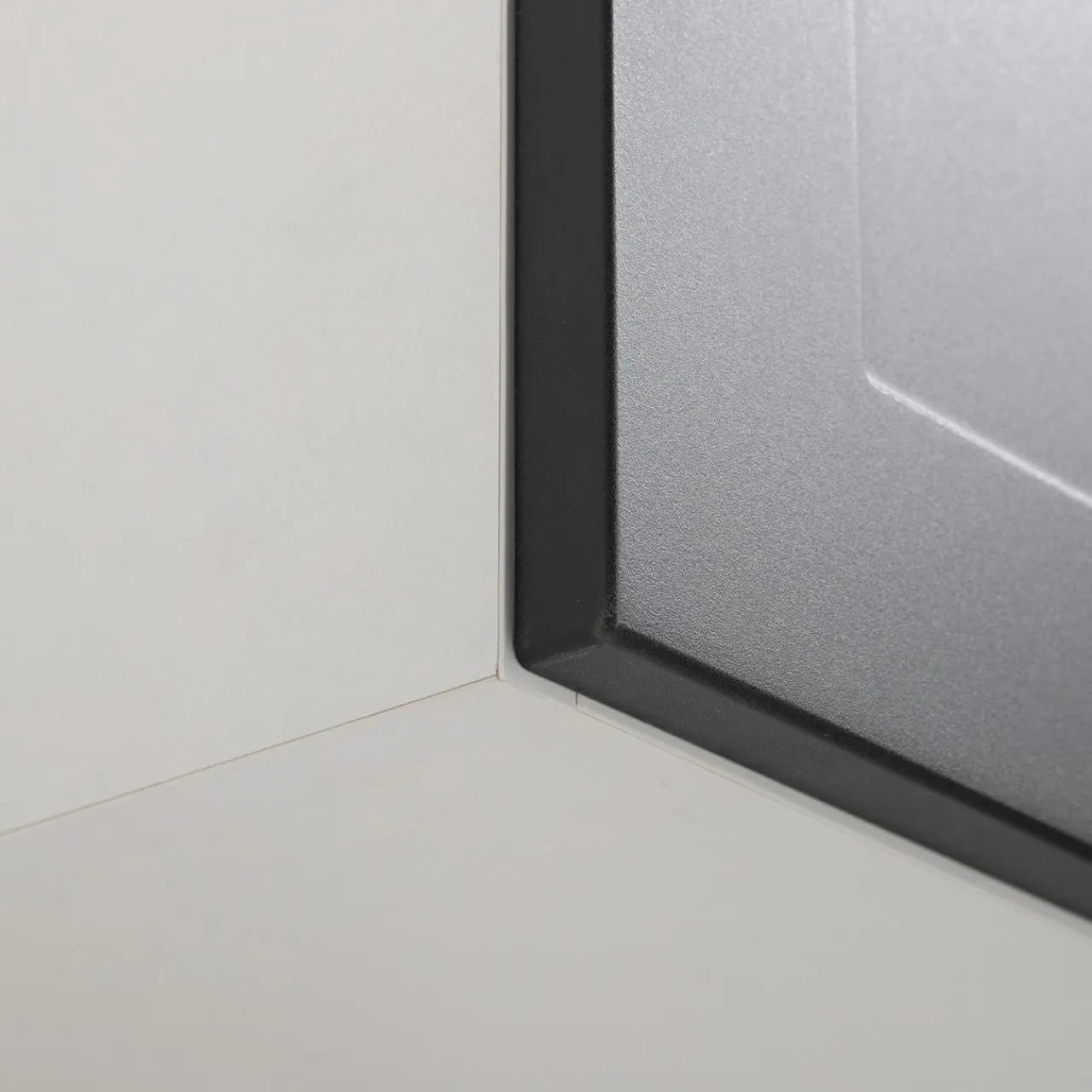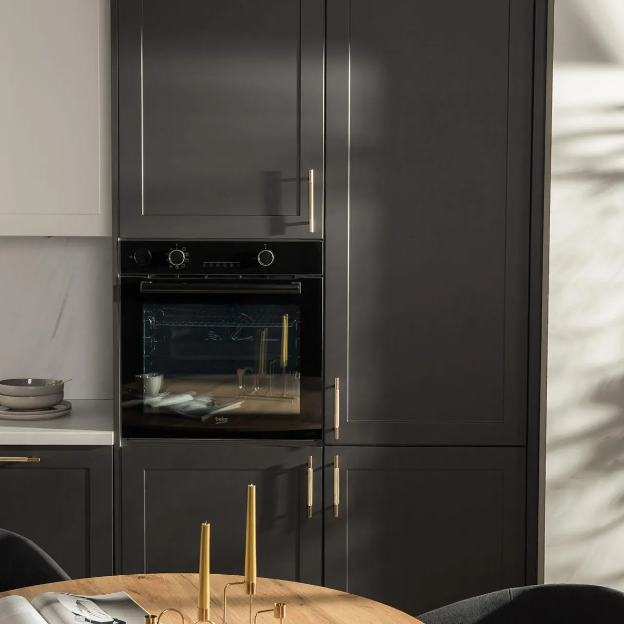 Front został wykończony folią PVC w grafitowym kolorze. Doskonale sprawdza się w połączeniu z wnętrzami utrzymanymi w odcieniach bieli oraz blatami w ciemnej i jasnej kolorystyce.
