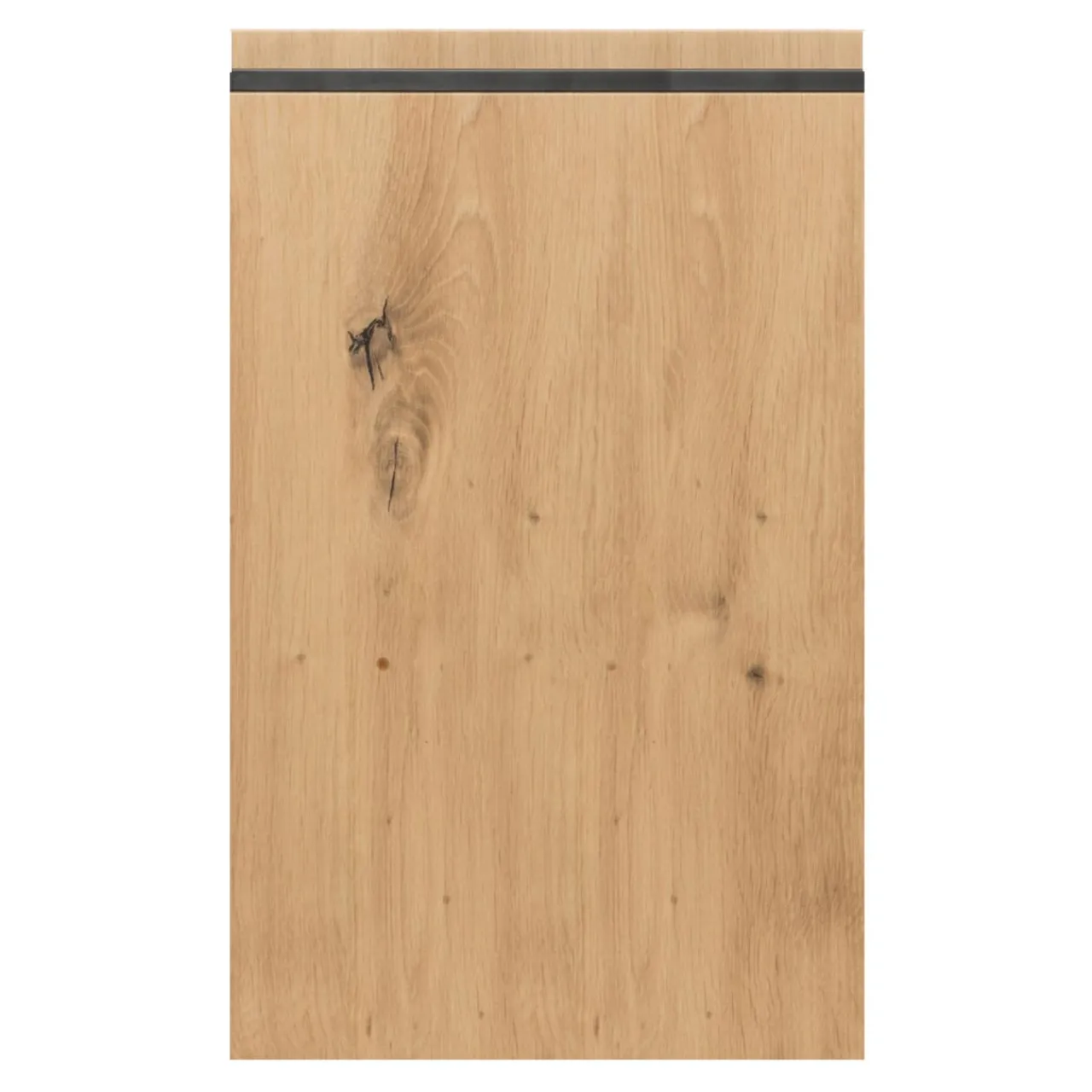 Dekor w kolorze drewna z doskonale widocznym usłojeniem sprawia, że front świetnie wygląda w połączeniu z jasnymi odcieniami bieli i szarości. Dodatkową zaletą jest uchwyt w formie frezu wykończonego czarną aluminiową listwą.