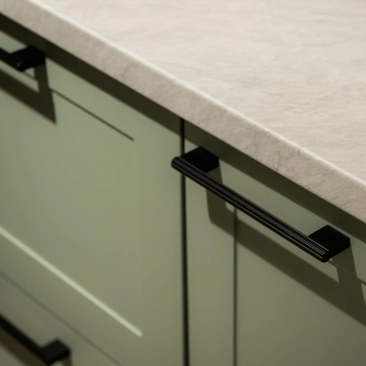 - szałwia to barwa nawiązująca do angielskiej stylistyki, bez kłopotu dobierzesz do wnętrza kuchni blat w kolorze marmuru lub naturalnego kamienia.
