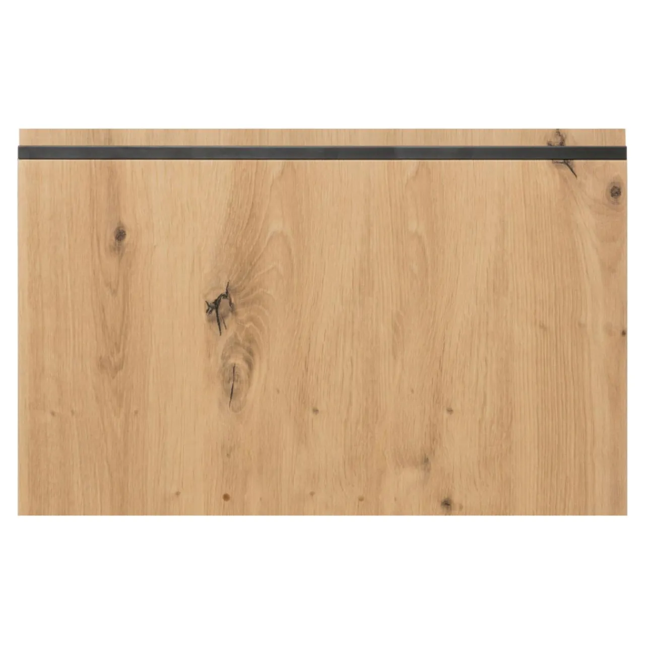 Dekor w kolorze drewna z doskonale widocznym usłojeniem sprawia, że front świetnie wygląda w połączeniu z jasnymi odcieniami bieli i szarości. Dodatkową zaletą jest uchwyt w formie frezu wykończonego czarną aluminiową listwą.