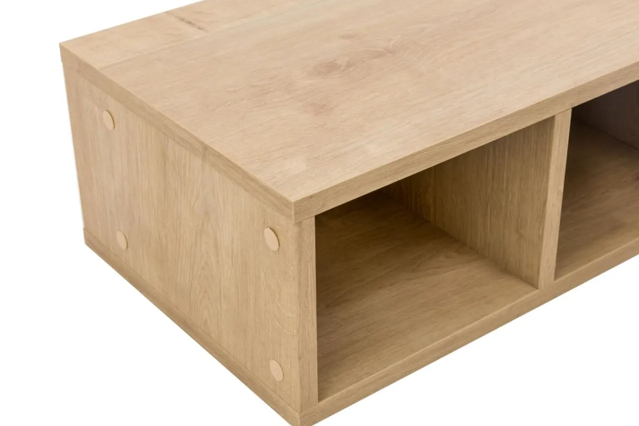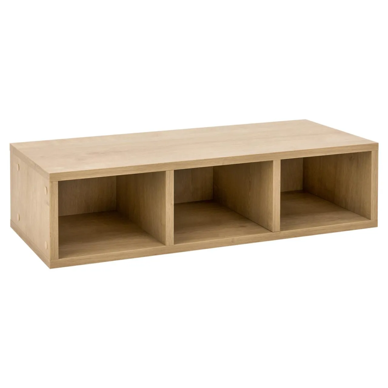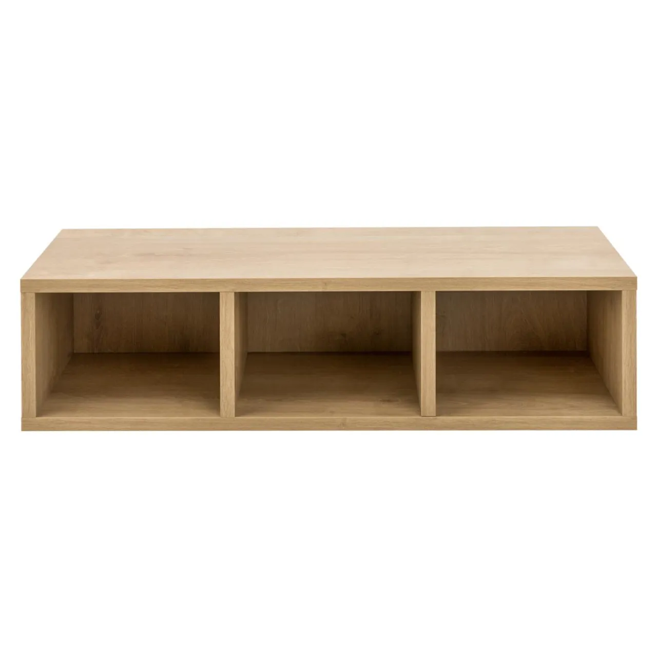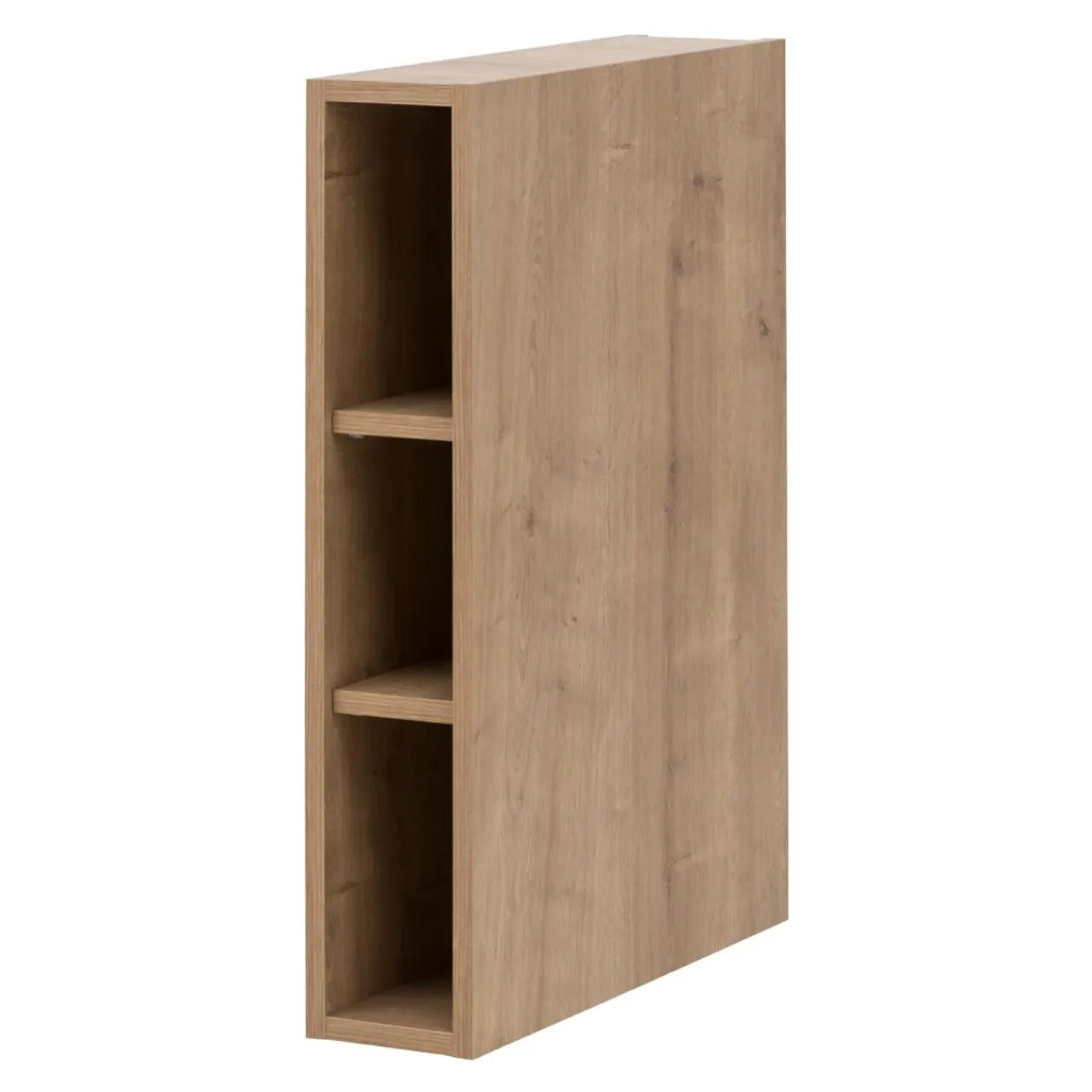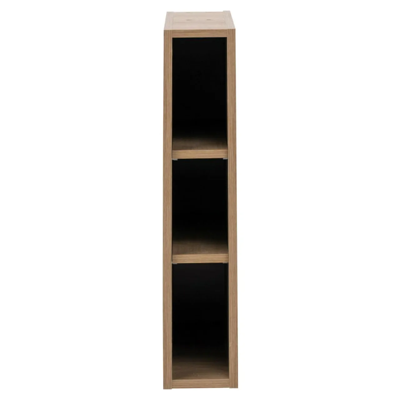 Regał wiszący CARAT został wykonany z płyty meblowej, wykończonej laminatem w kolorze dąb hamilton. Jasne wybarwienie o naturalnej tonacji sprawia, iż świetnie współgra z wnętrzami utrzymanymi w jasnej kolorystyce z kontrastowymi czarnymi elementami.