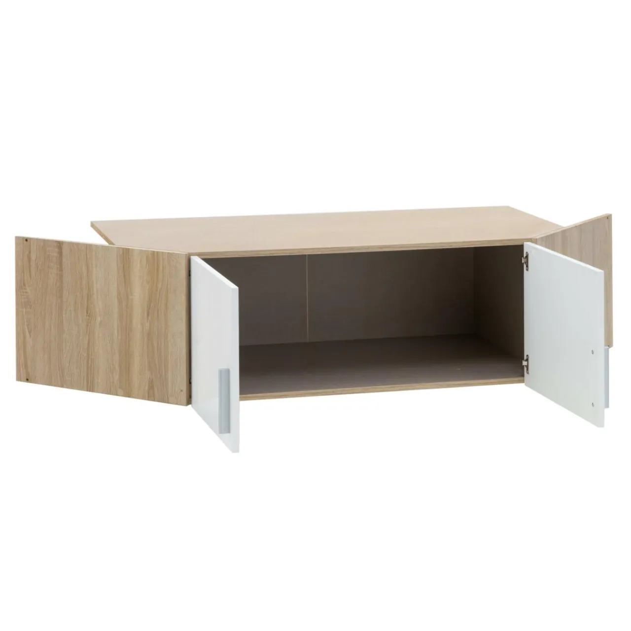 Korpus z dekoracyjnym nadrukiem w kolorze dąb sonoma, białe fronty wykończono na wysoki połysk. Proste srebrne uchwyty dodają wyrazistości.