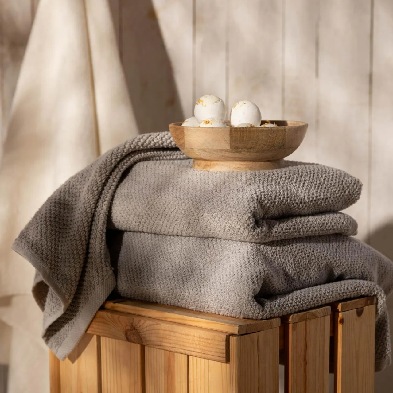 Miękki, jasnoszary ręcznik BOVI ozdobi nowoczesną łazienkę.
