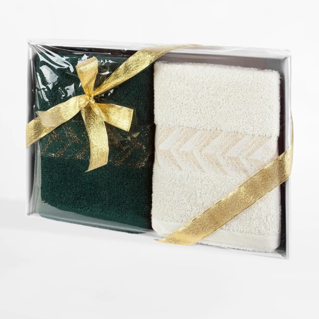 - ręcznik o wymiarach: 50×90 cm, o ciemnozielonym kolorze.