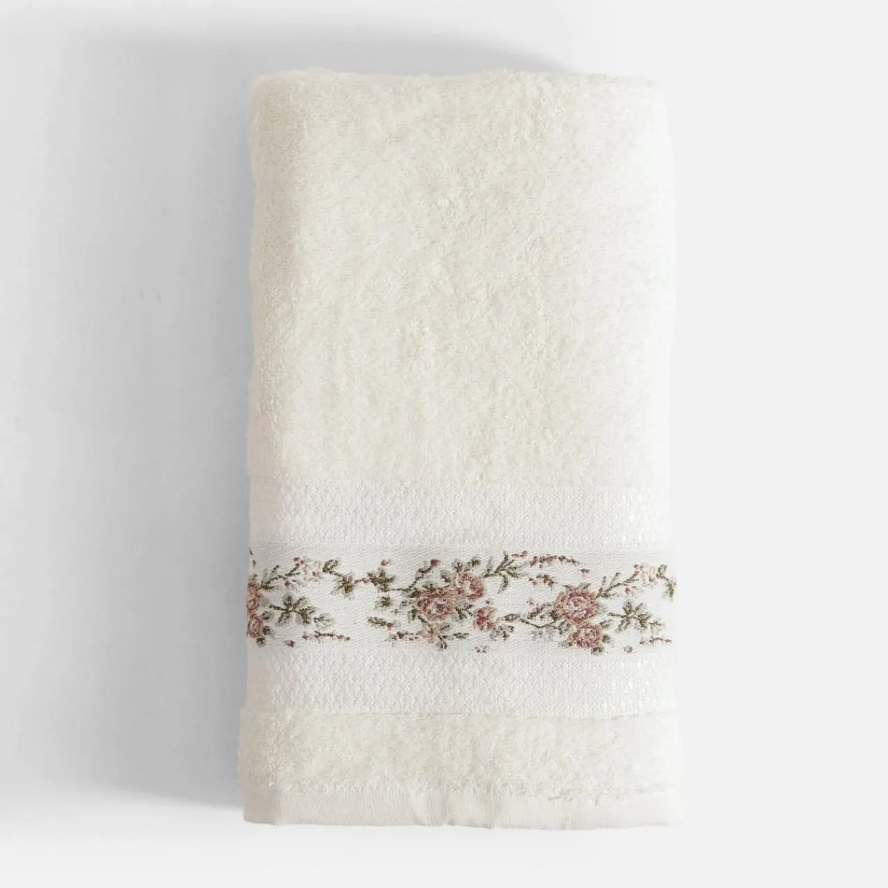 - Kwiatowy motyw na ręczniku dodaje mu romantycznego akcentu, dlatego złożony będzie prawdziwą ozdobą na półce.