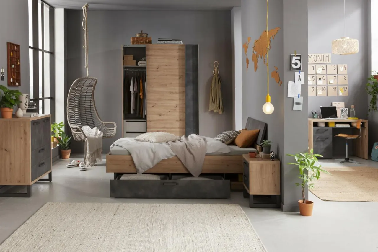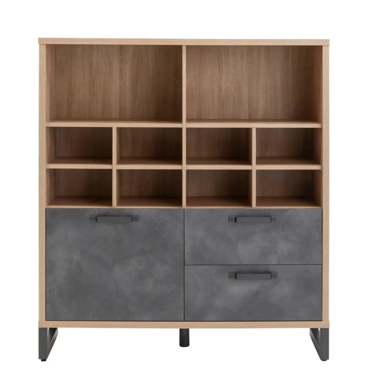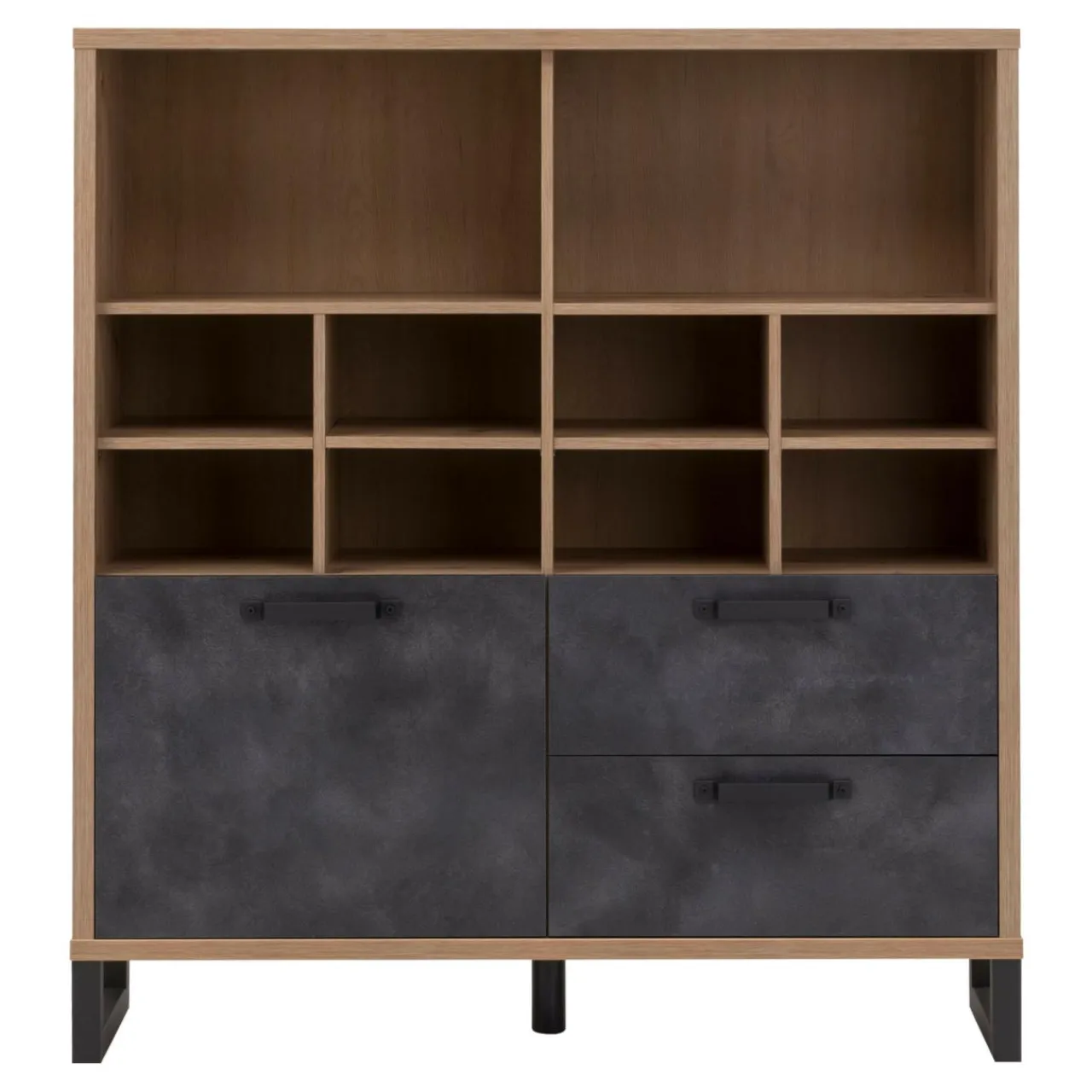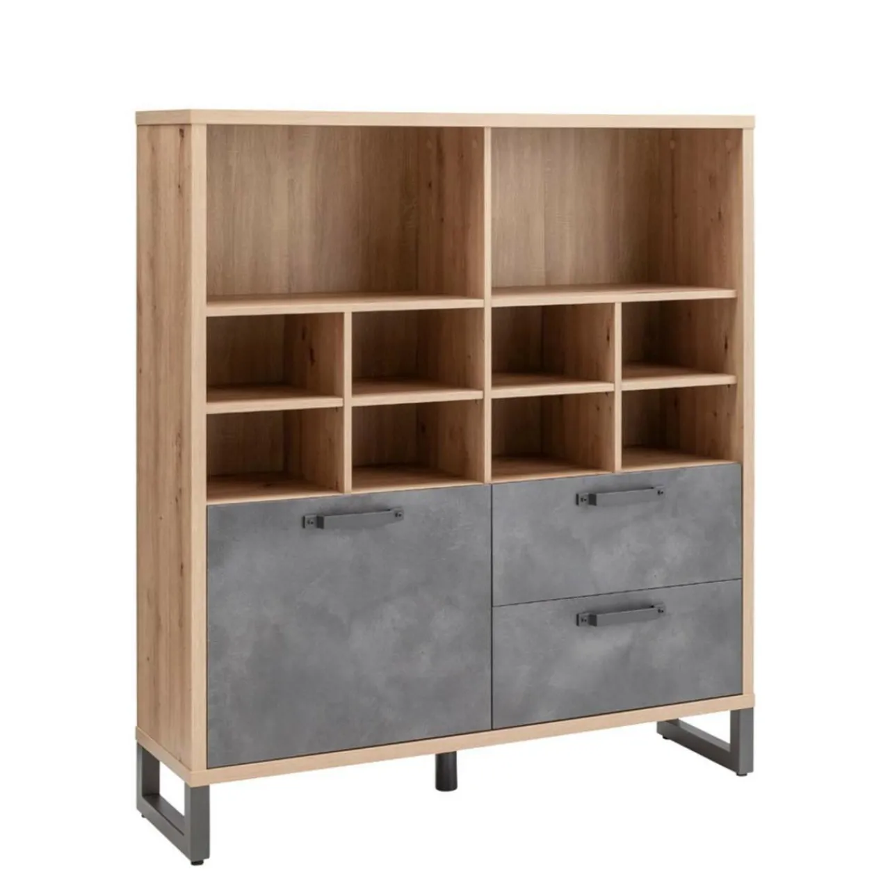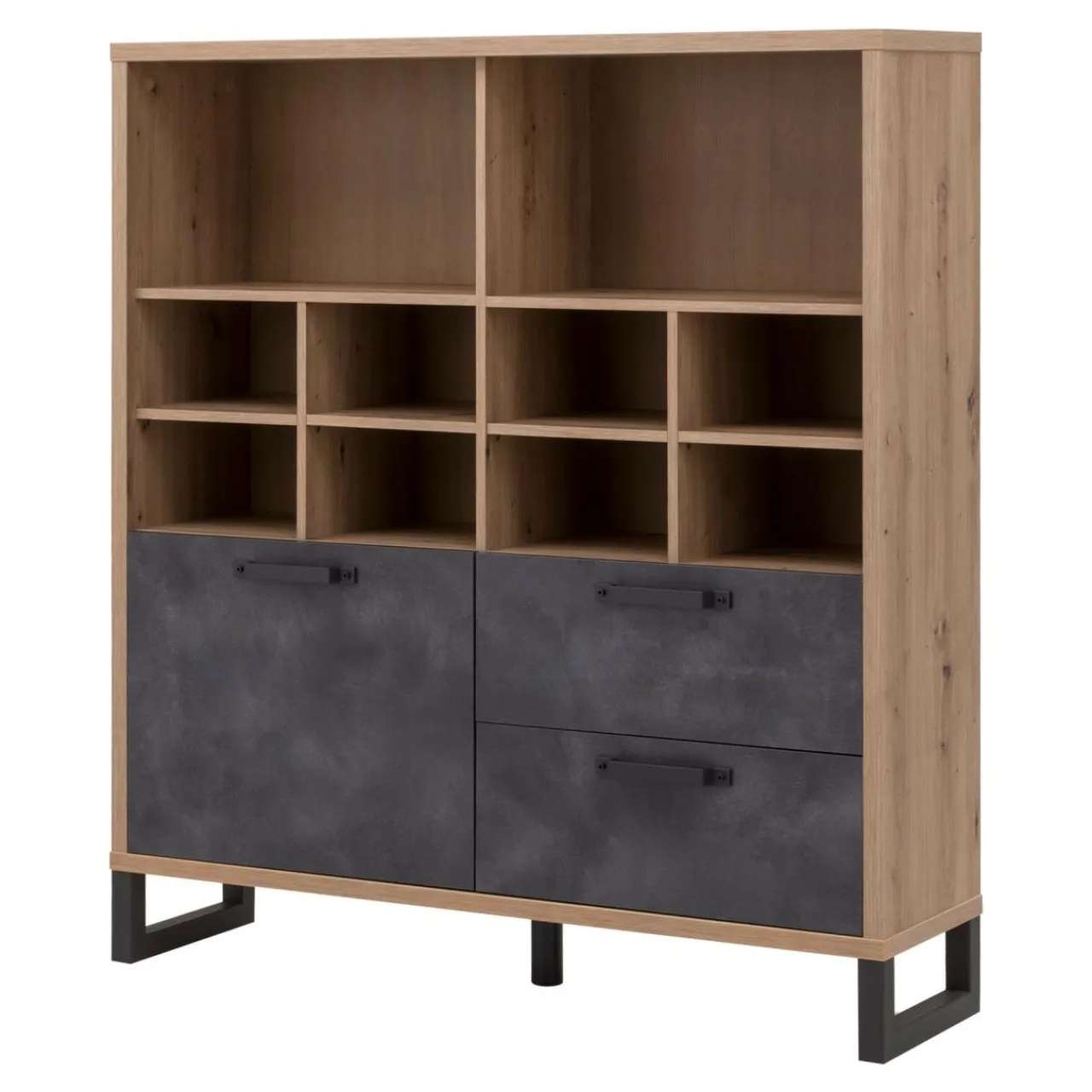 Industrialna stylistyka regału świetnie zestawia jasną kolorystykę w barwie dębu artisan z ciemnym, imitującym beton dekorem nawiązując do surowego minimalizmu japońskiego. Regał pięknie wyróżni się więc we wnętrzach nowoczesnych, industrialnych oraz tych, których aranżacja hołduje prostocie i kolorystycznemu ascetyzmowi.