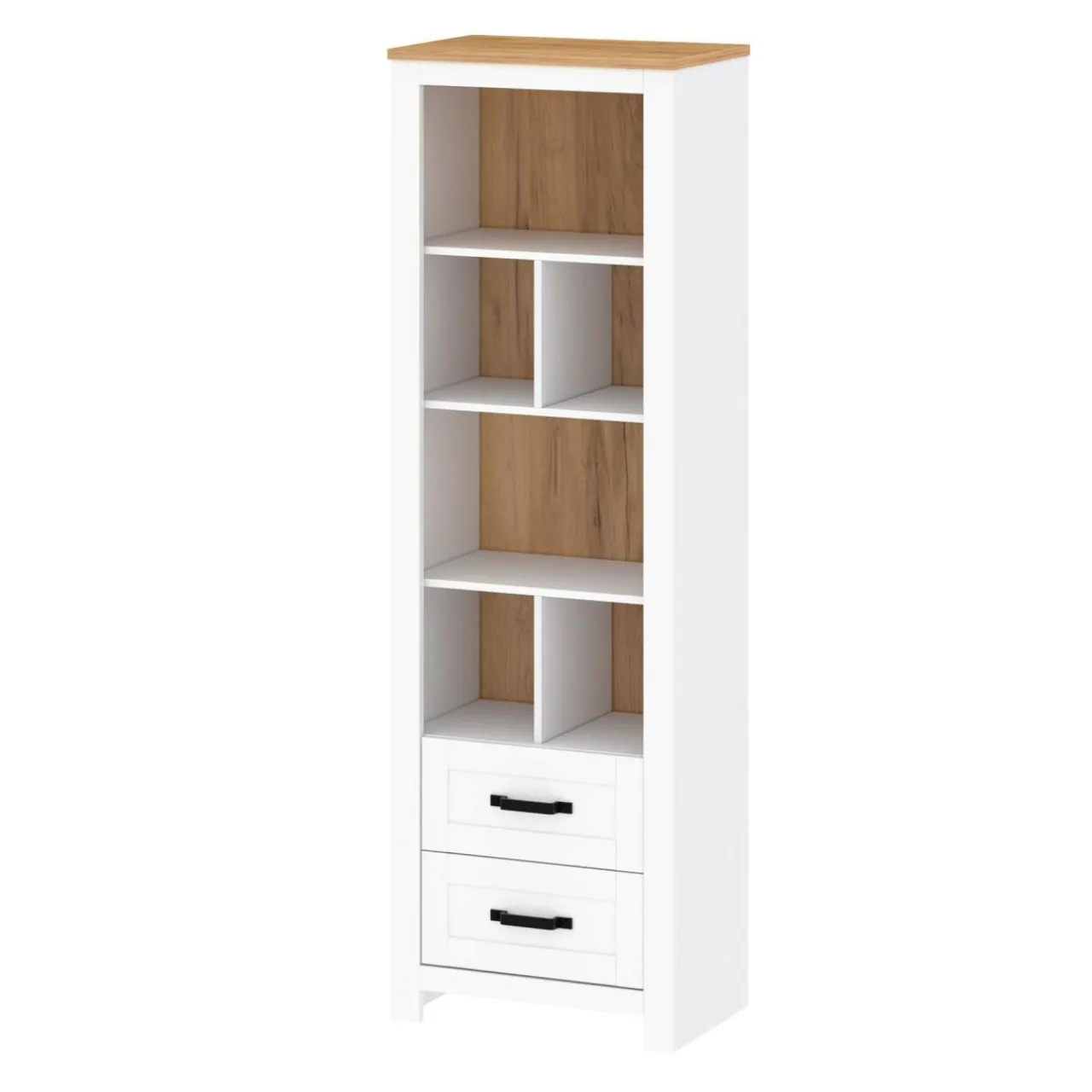 Regał LANZETTE posiada ciekawy układ. Węższe i szersze półki pozwalają poeksperymentować z ustawieniem książek oraz ozdób, zaś dolna część mebla wyposażona została w 2 szuflady na prowadnicach kulkowych. Półki posiadają możliwość obciążenia do 5 kg.