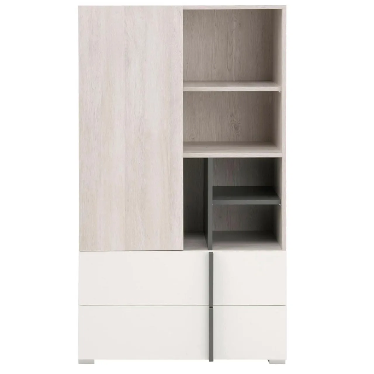 - Wykończenie w kolorze antracytu, białego matu i białego dębu Wilson sprawia, że regał REMO z łatwością wkomponujesz w jasne, nowoczesne wnętrze.