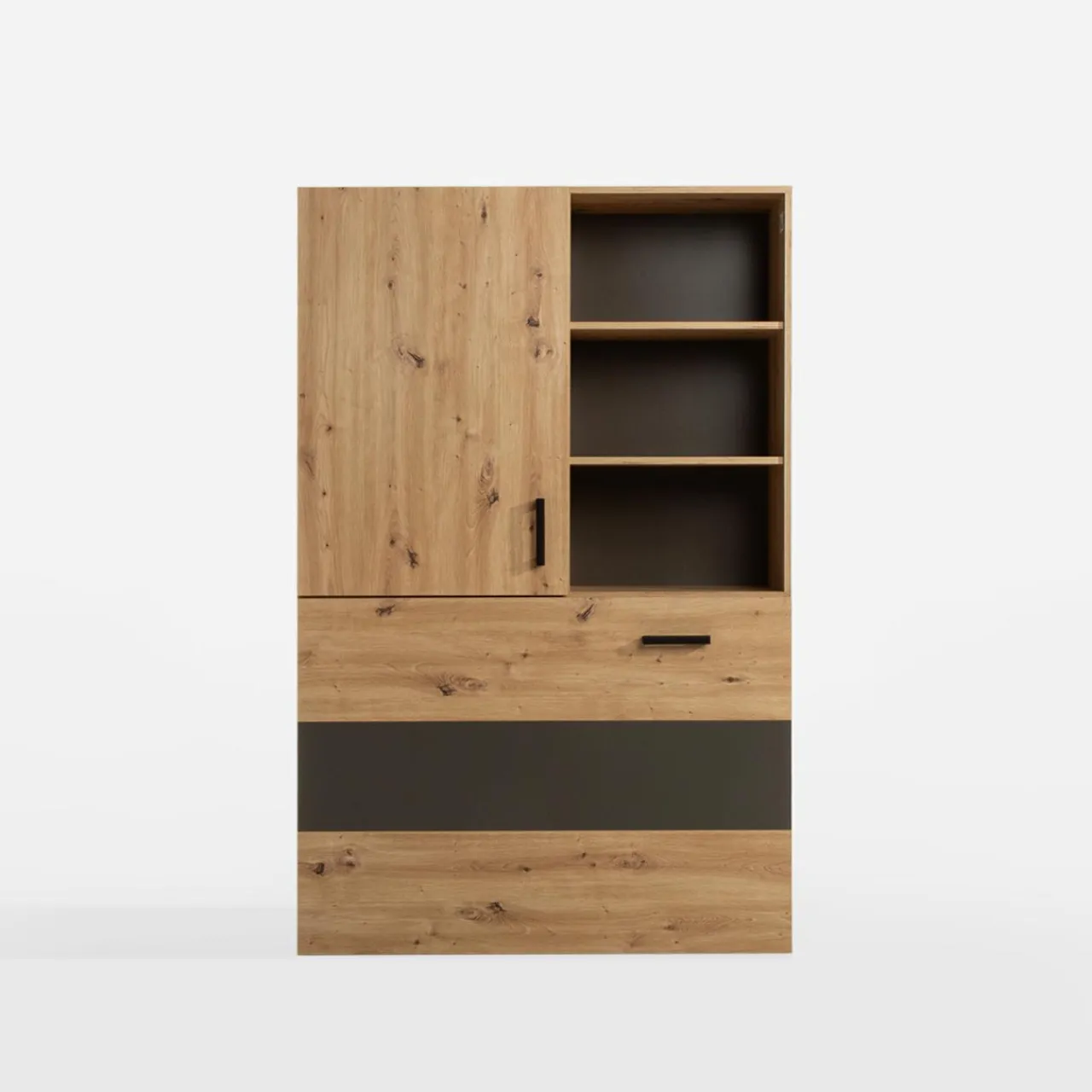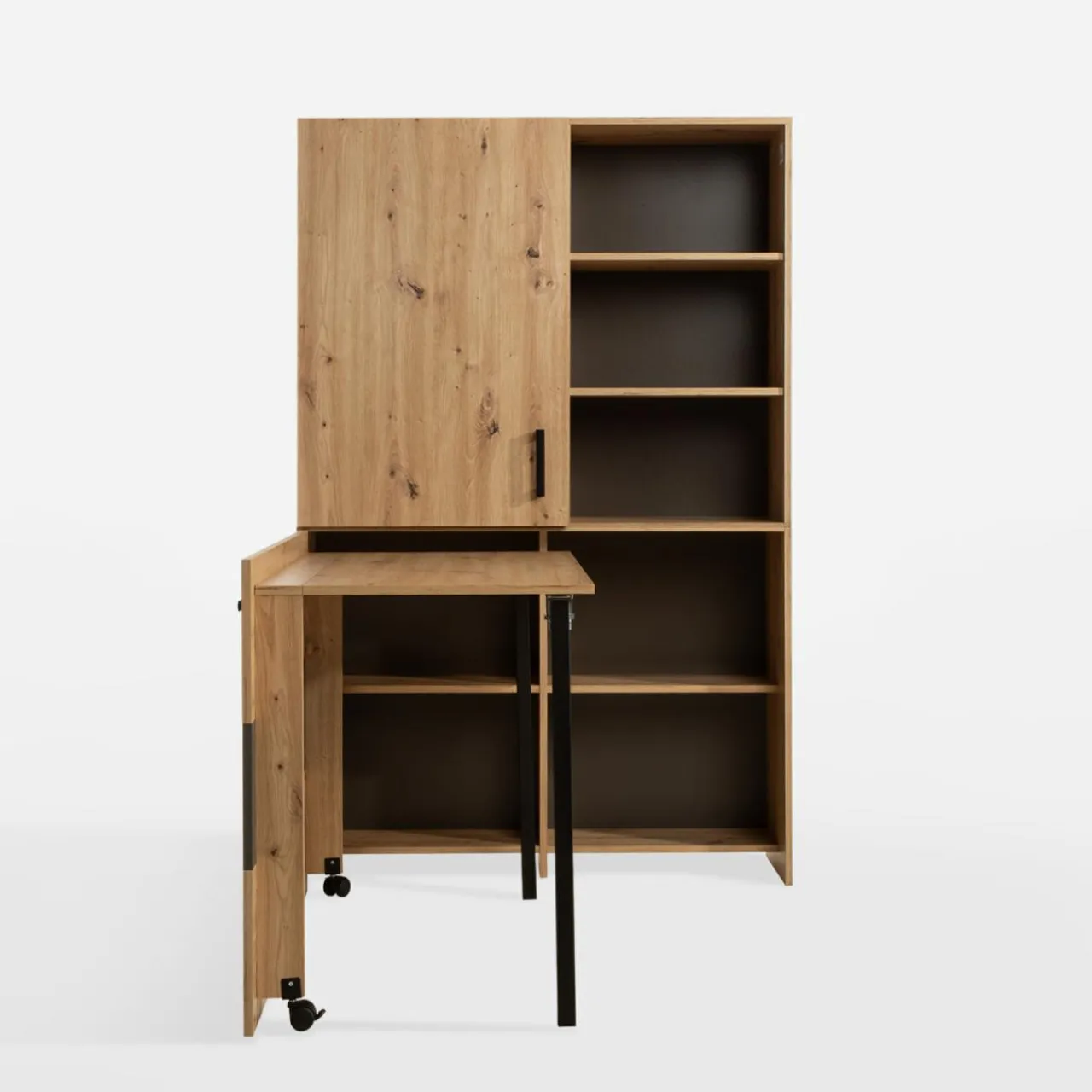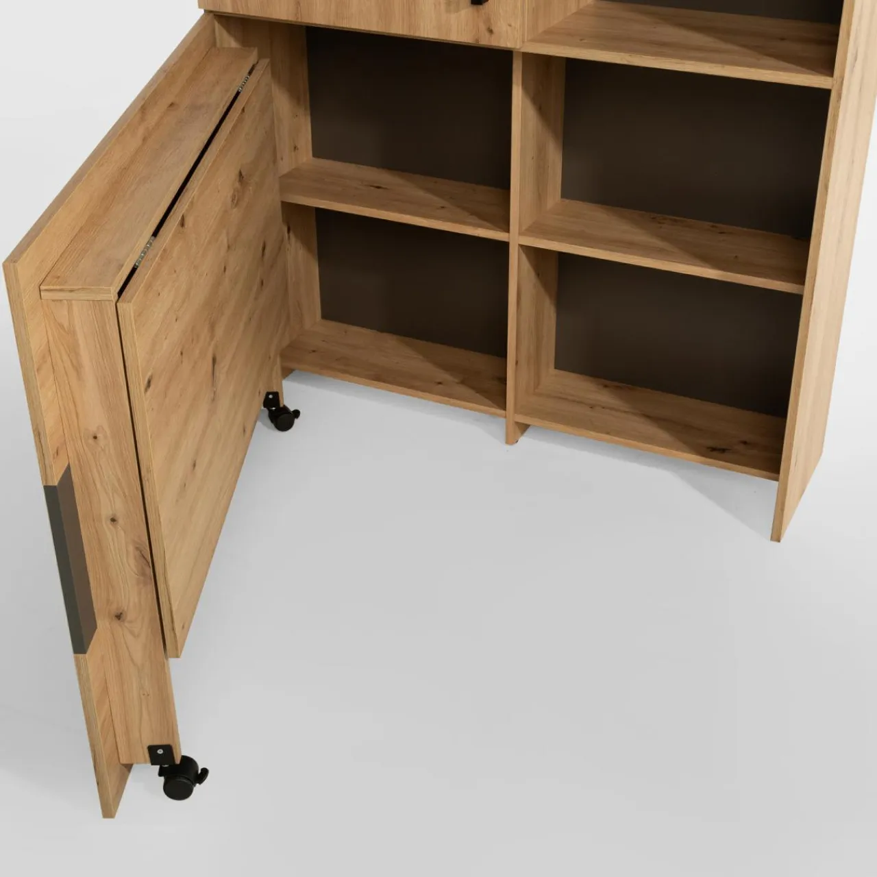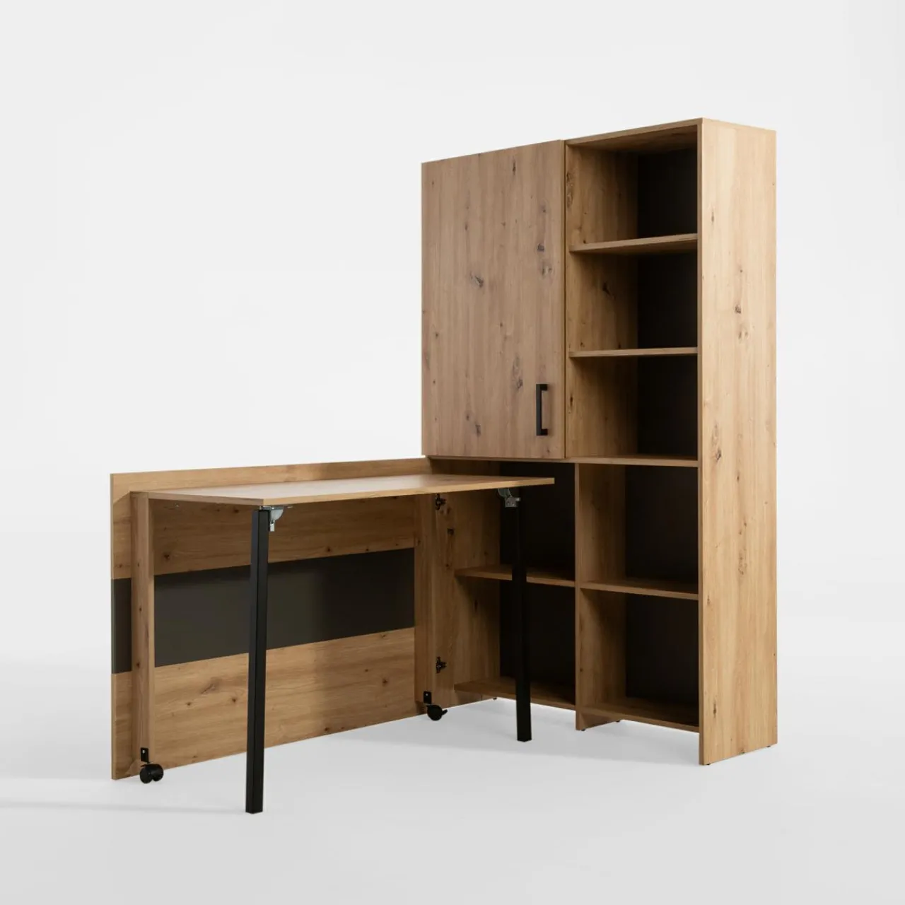 Na co dzień będzie zwykłym regałem. Gdy przyjdzie czas na naukę lub pracę w domu, otwórz i rozłóż biurko OXFORD. Ten niepozorny mebel wykorzystasz w mniejszych gabinetach domowych, pokoju młodzieżowym lub kawalerce.