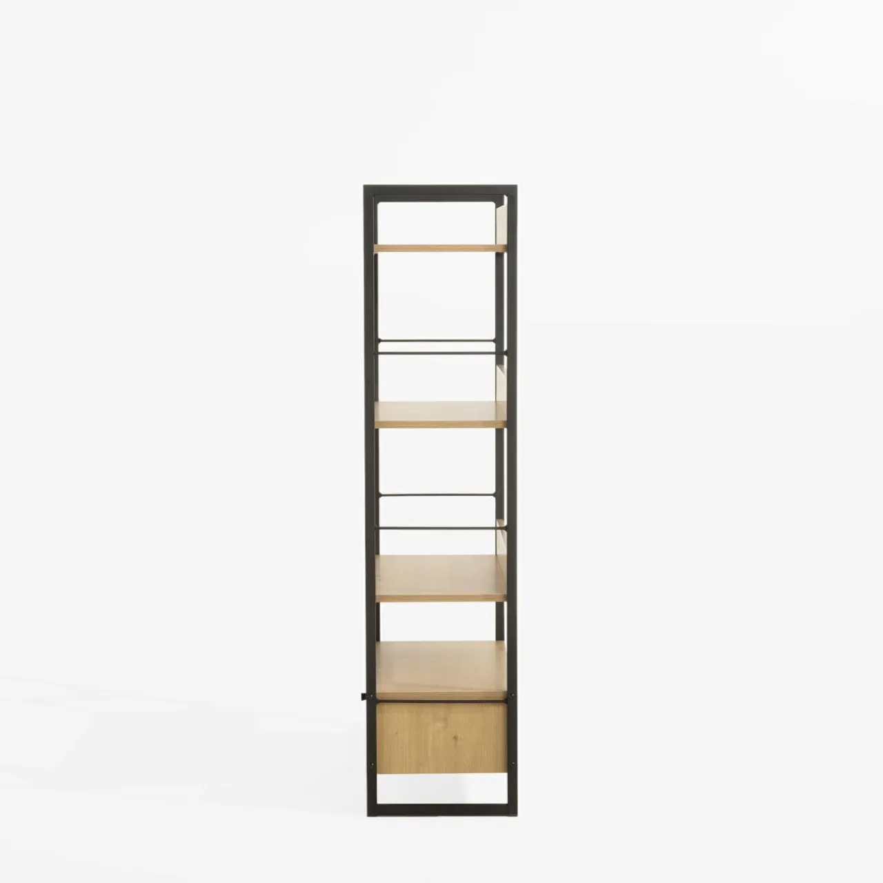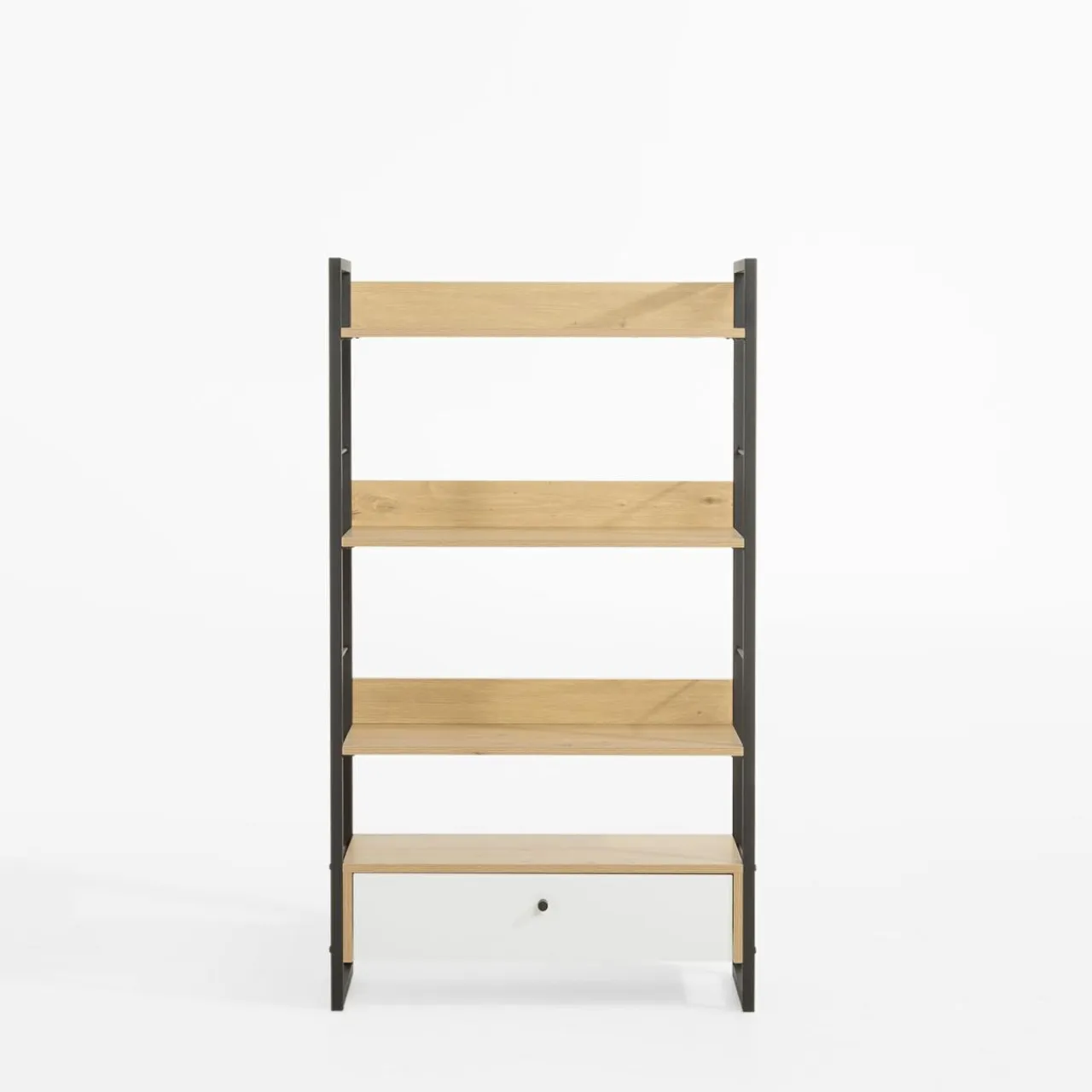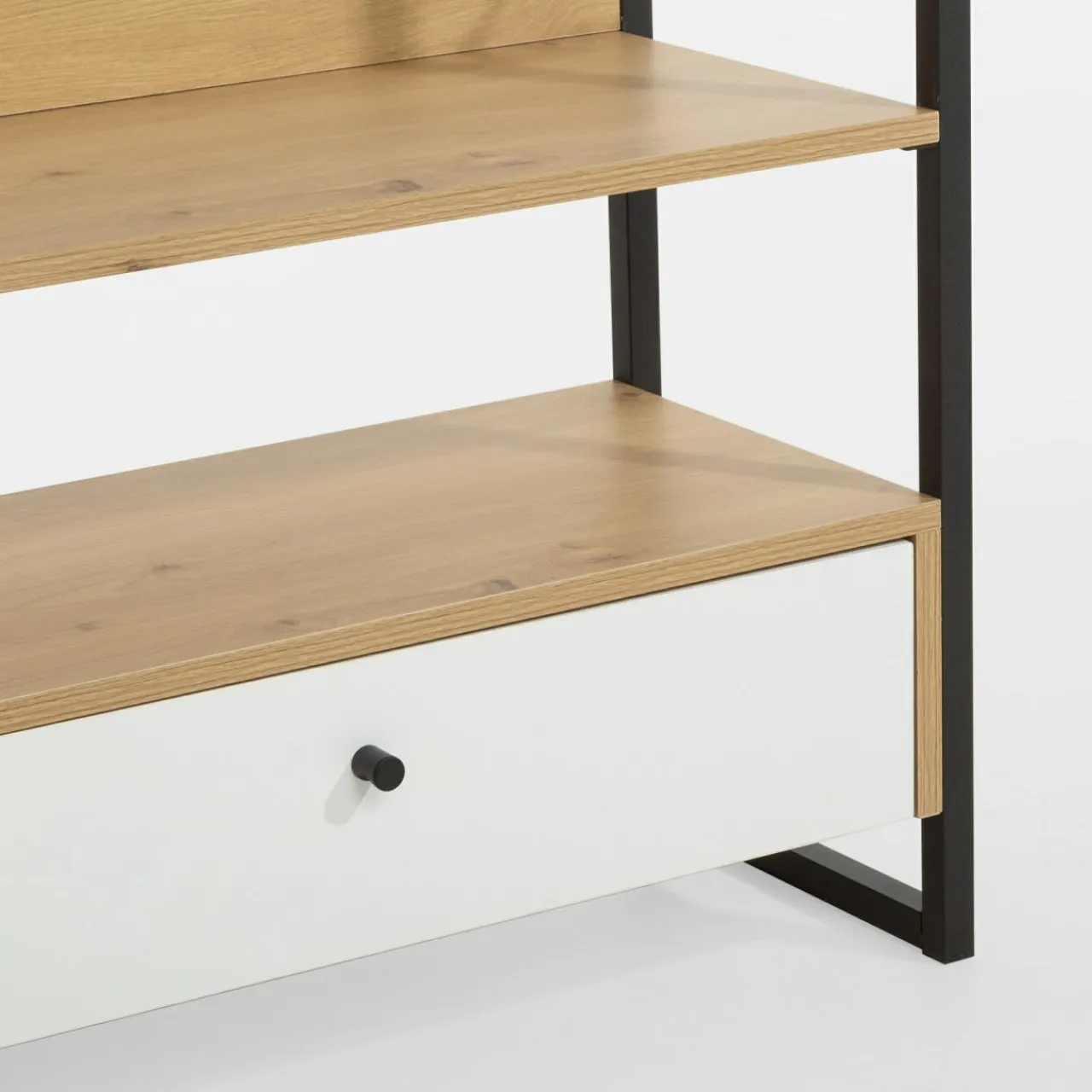 Regał z szufladą biały LINEARDO to mebel, który doskonale sprawdzi się w salonie, sypialni, gabinecie czy pokoju dziecięcym. Połączenie czarnej stalowej ramy z jasnymi półkami i białą szufladą nadaje mu nowoczesny, inustrialny charakter. Jest praktycznym rozwiązaniem, które pozwala uporządkować przestrzeń.