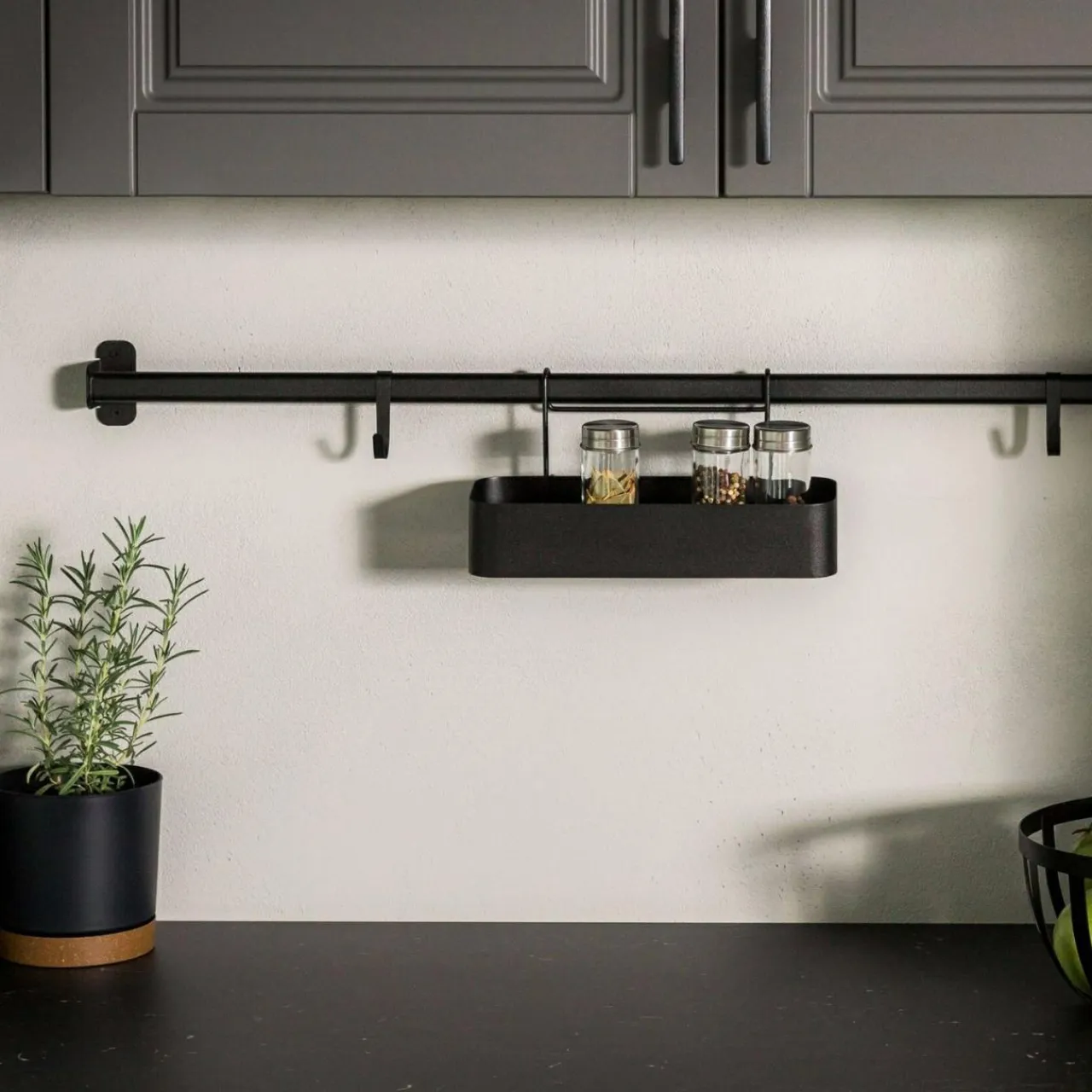 Zamiast zastawiać powierzchnię blatu lub zapełniać wnętrza szafek, możesz zastosować w kuchni system relingów.