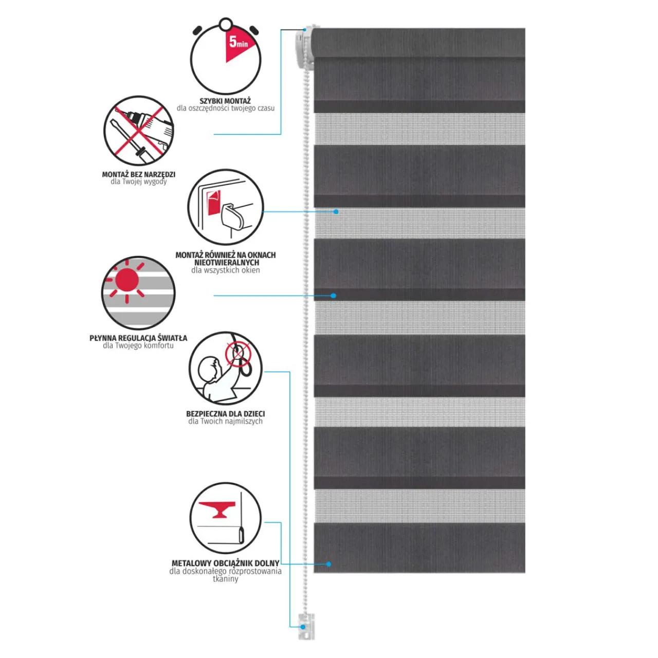 - montaż bez użycia narzędzi – roleta do zawieszenia lub przyklejenia na skrzydło okna;