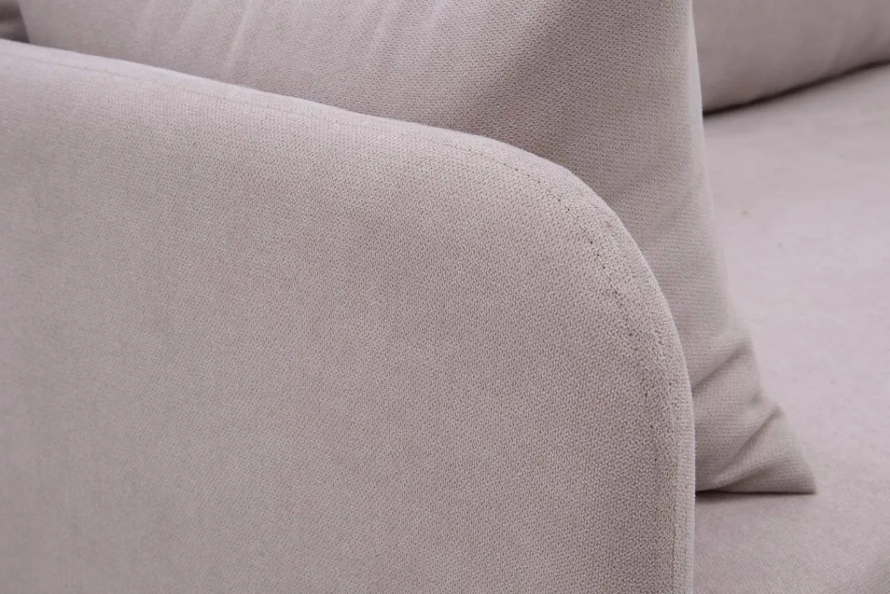 Sofę wykończono plecioną tkaniną ASTI w beżowym odcieniu. Materiał na bazie weluru prezentuje się elegancko, a dodatkowo jest przyjemny w dotyku.