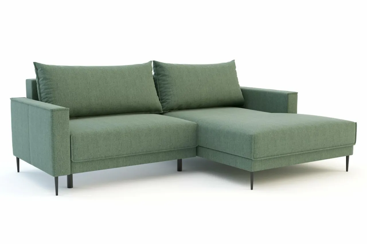 Narożnik osadzony jest na wysokich nóżkach, co nadaje mu lekkości i ułatwia zachowanie czystości pod nim.