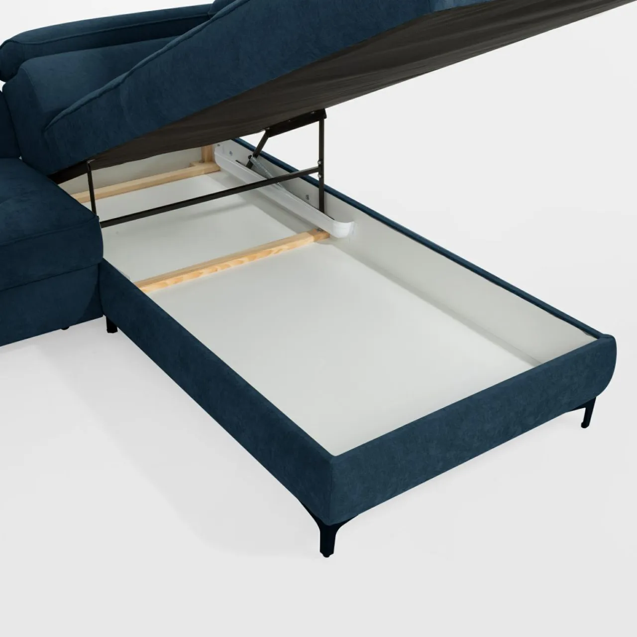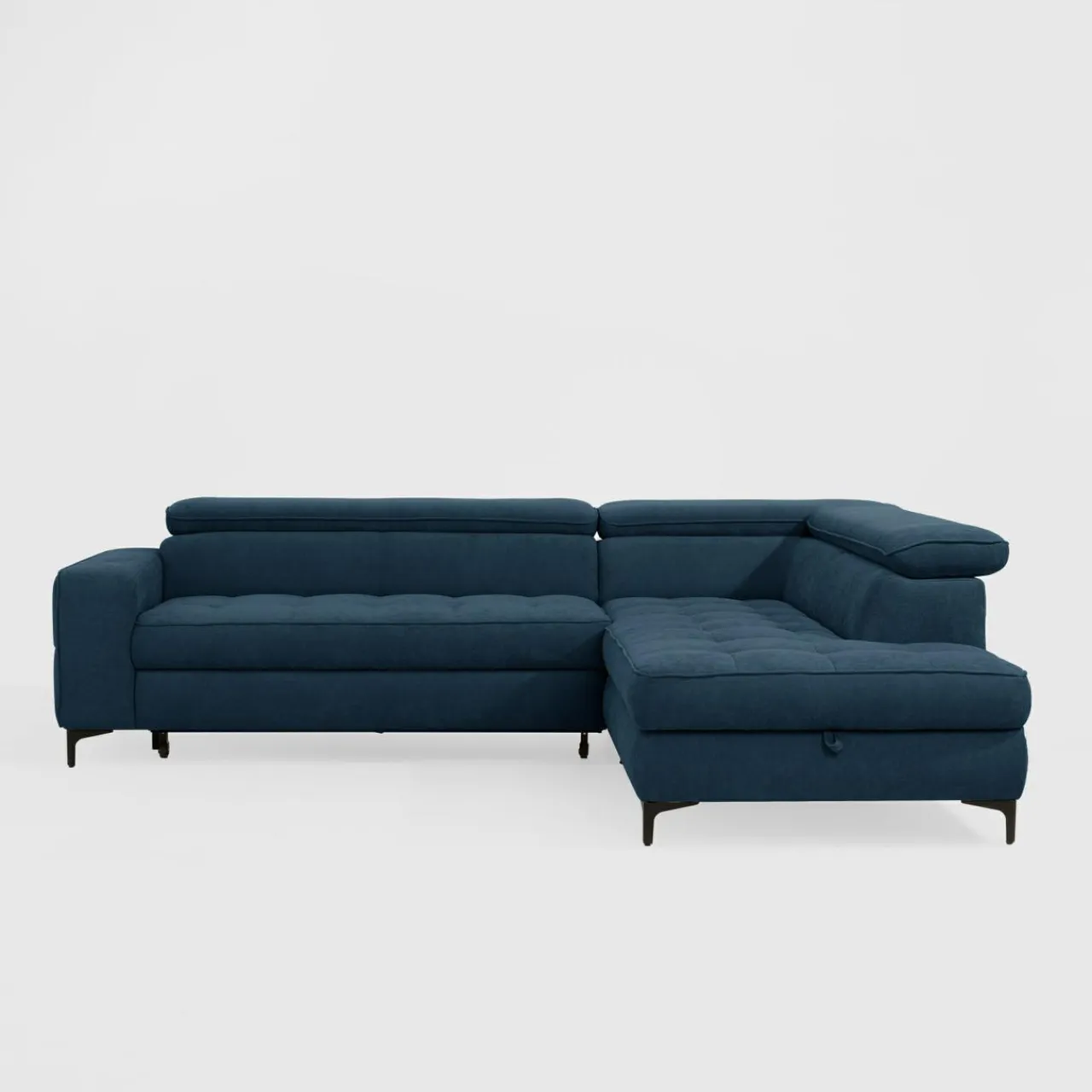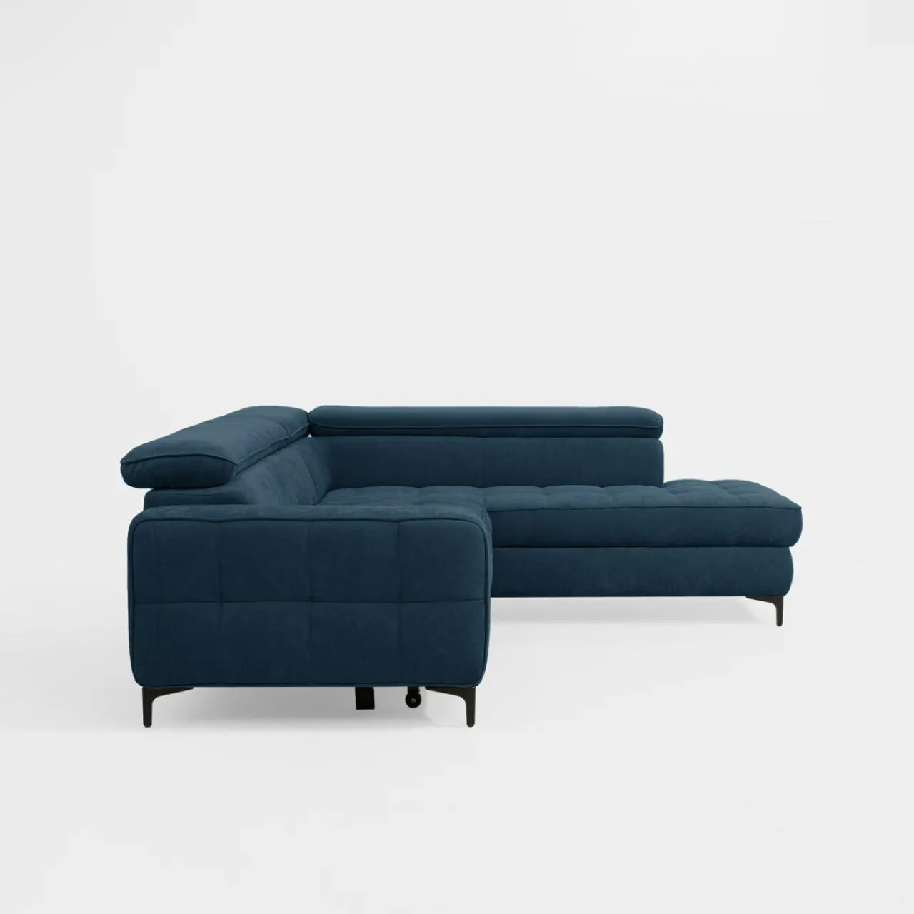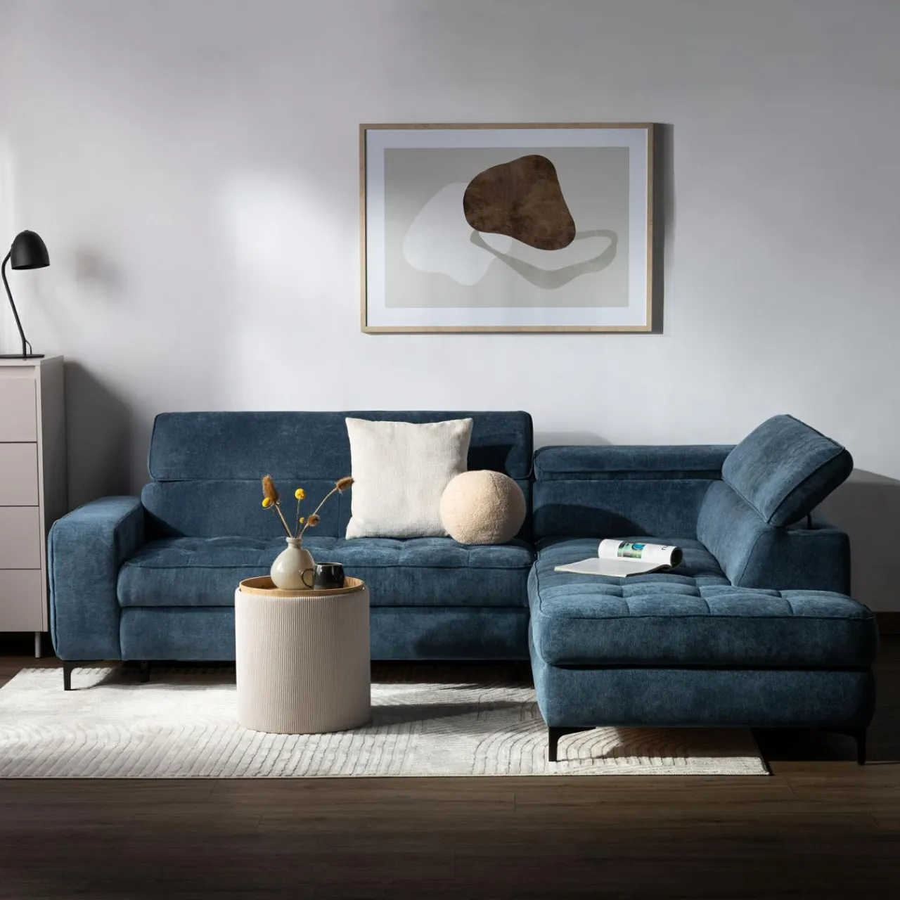 Narożnik NALA w granatowej tkaninie dopełni nowoczesny bądź marynistyczny salon. Przestronny mebel docenisz za regulowane zagłówki, pojemnik pod siedziskiem i przyjemne w dotyku obicie.