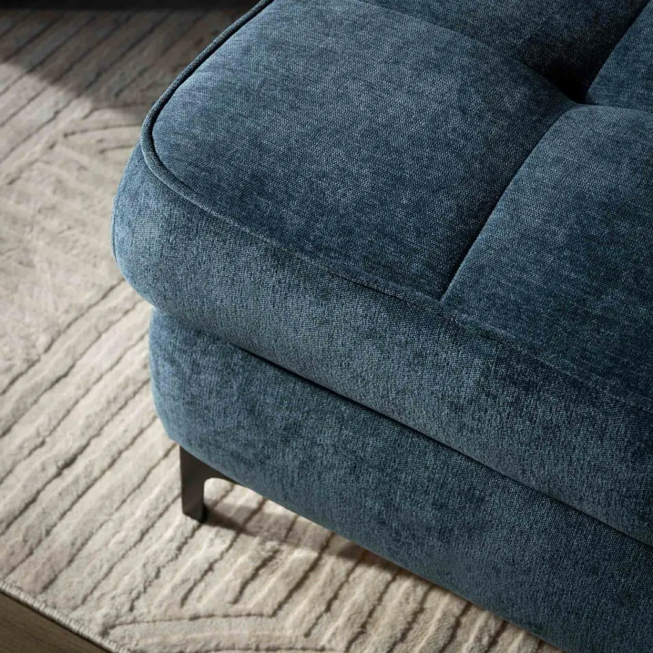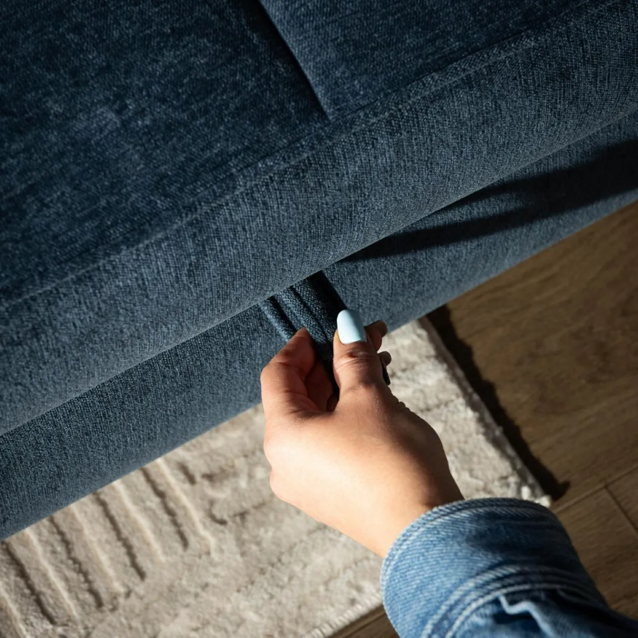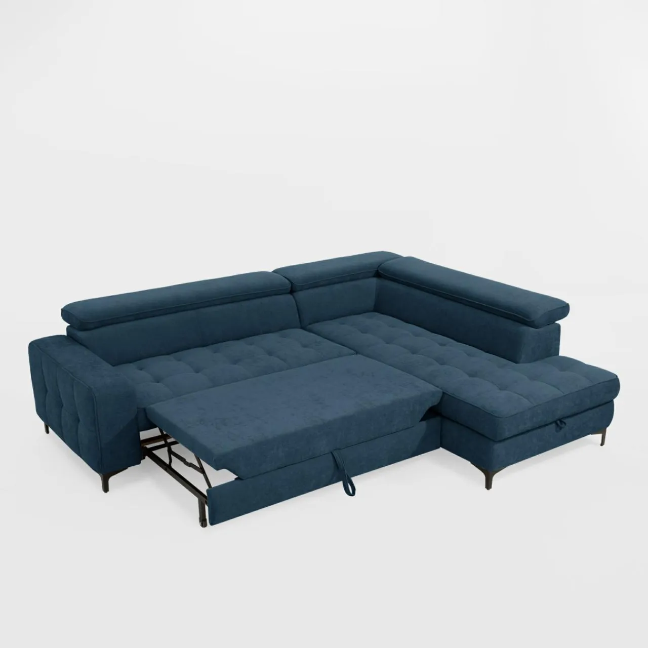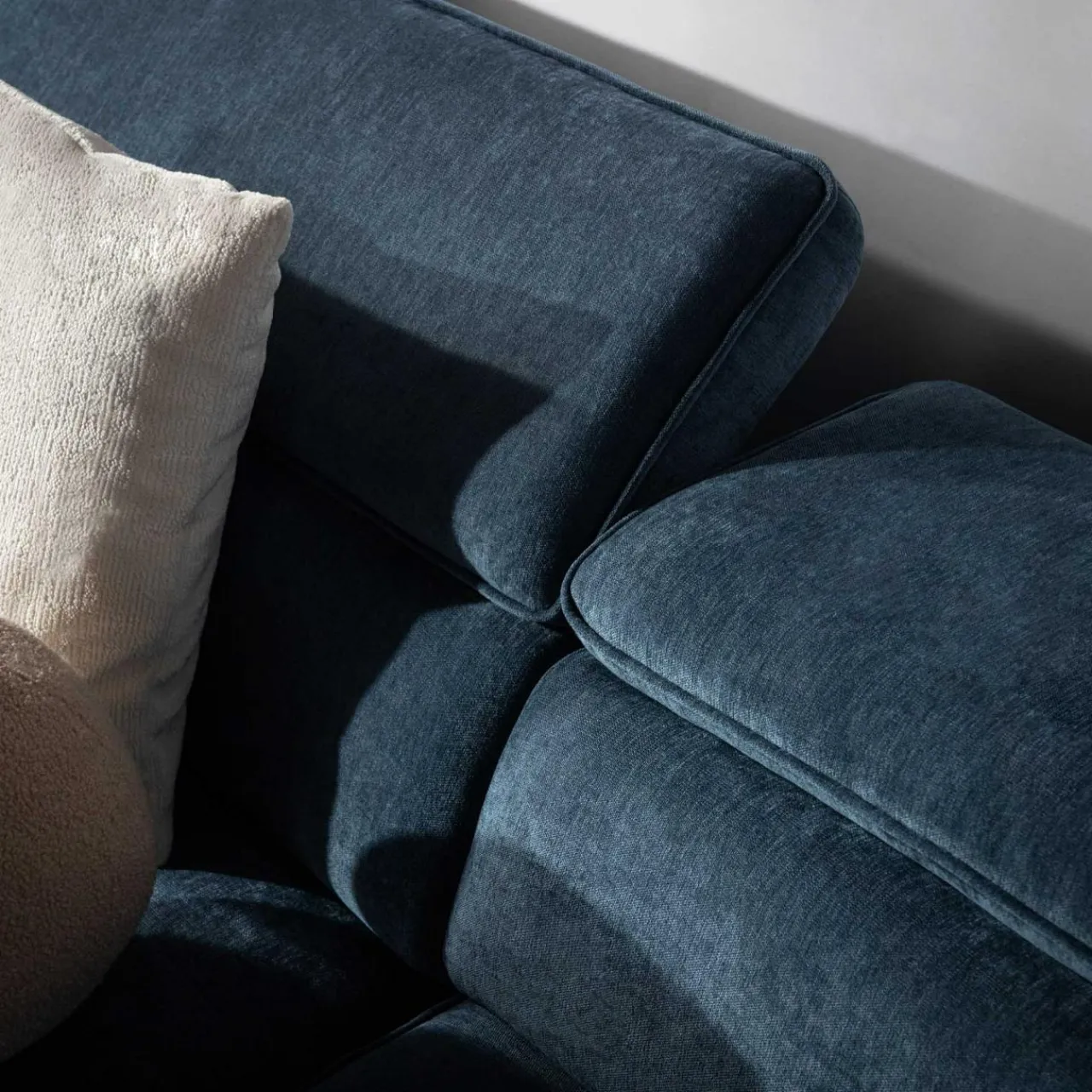 Narożnik NALA w granatowej tkaninie dopełni nowoczesny bądź marynistyczny salon. Przestronny mebel docenisz za regulowane zagłówki, pojemnik pod siedziskiem i przyjemne w dotyku obicie.
