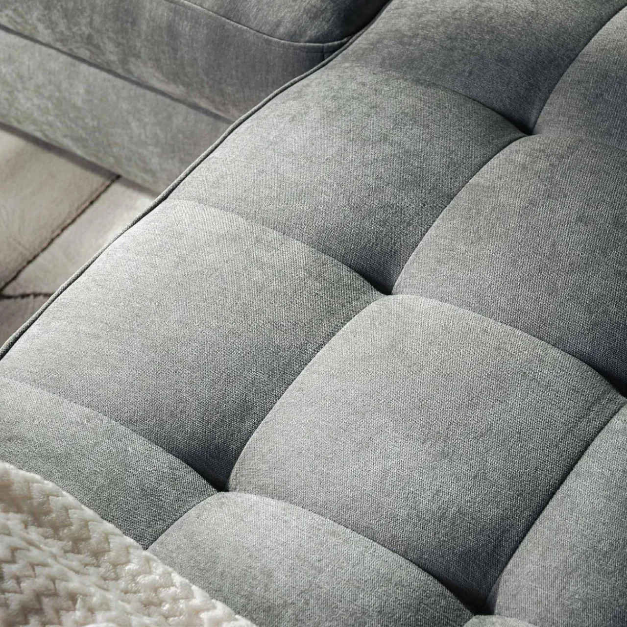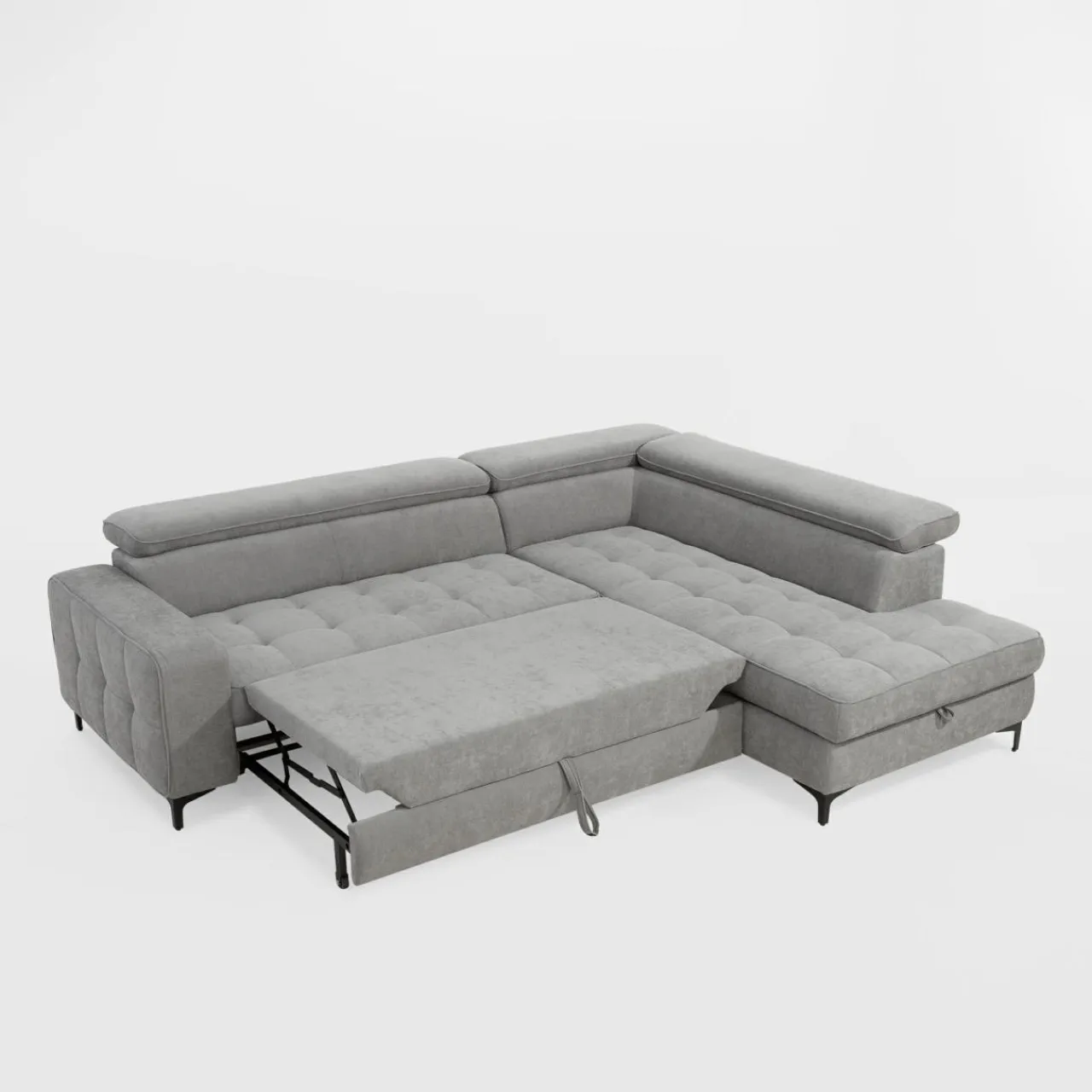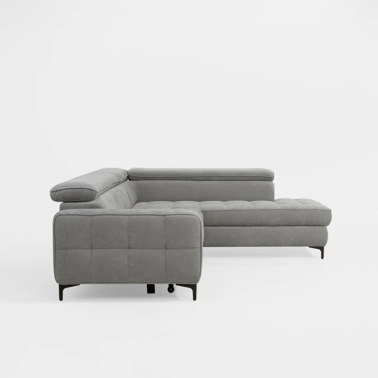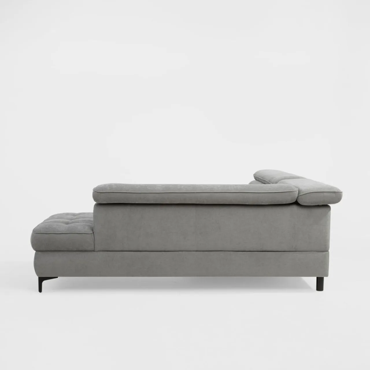 Narożnik NALA w szarej tkaninie odnajdzie się w nowoczesnym salonie. Przestronny mebel docenisz za regulowane zagłówki, pojemnik pod siedziskiem i przyjemne w dotyku obicie.