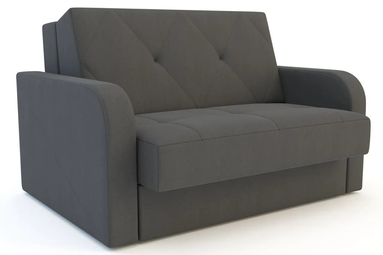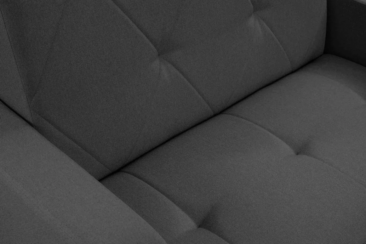 Grafitowa sofa to uniwersalna propozycja do większości wnętrz. Ozdobne przeszycia na poduchach dodają jej eleganckiego charakteru.