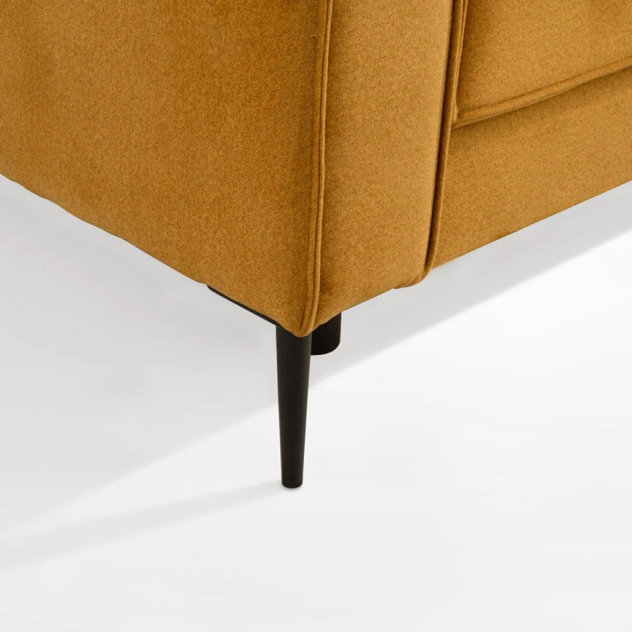- Tapicerka została wykonana z miękkiej w dotyku, welwetowej tkaniny w musztardowym kolorze z efektem dwutonu.