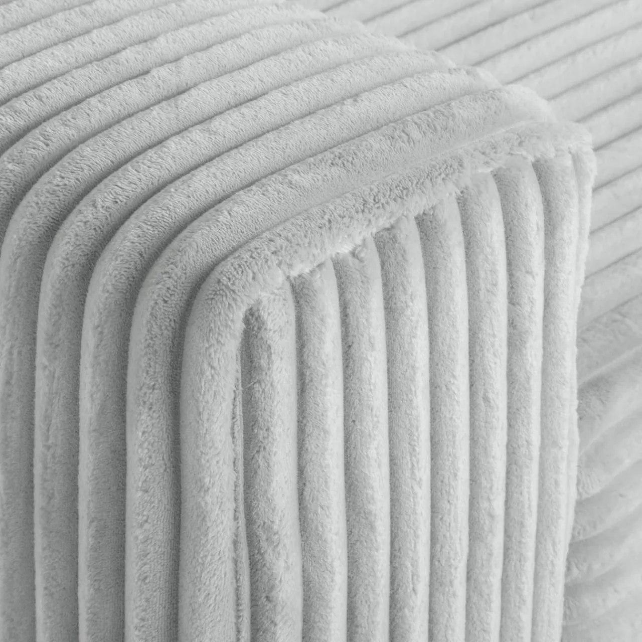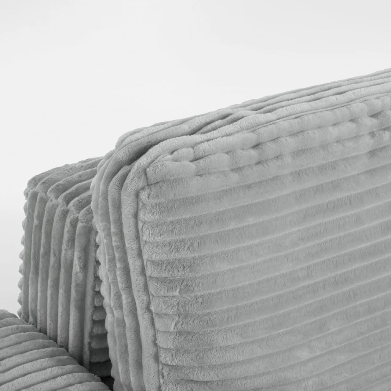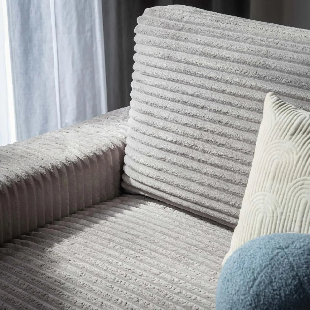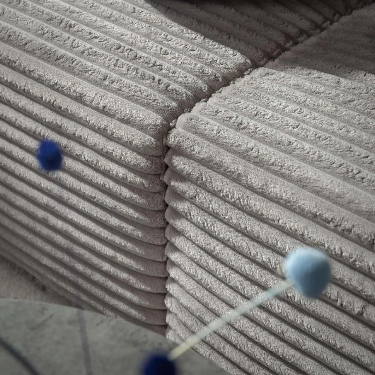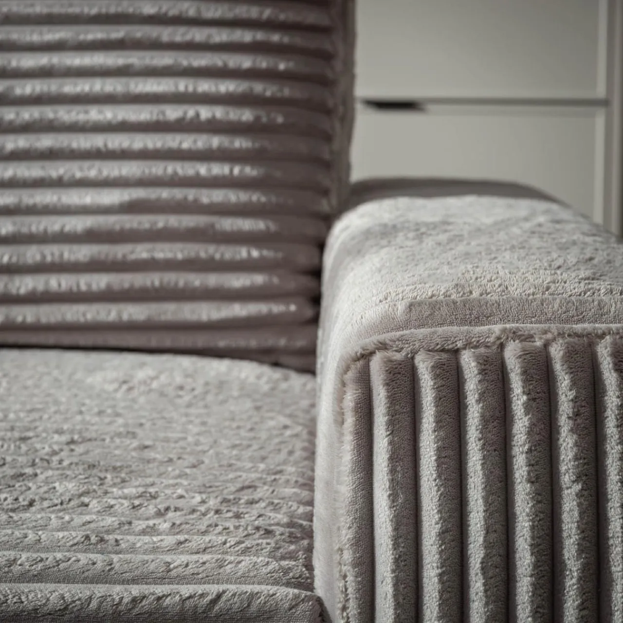 Sofa ANAFI wyróżnia się geometrycznym designem i sztruksową prążkowaną tkaniną, która zwraca uwagę i przełamuje jednolite gładkie powierzchnie. Zestawiona z neutralnymi barwami ścian wyciszy otoczenie, w którym z przyjemnością odpoczniesz.