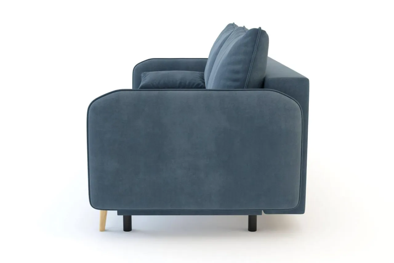 Sofa utrzymana jest w nowoczesnym stylu. Smukła linia w połączeniu z miękką, welurową tkaniną sprawiają, że możesz wkomponować ją w różne aranżacje wnętrz.