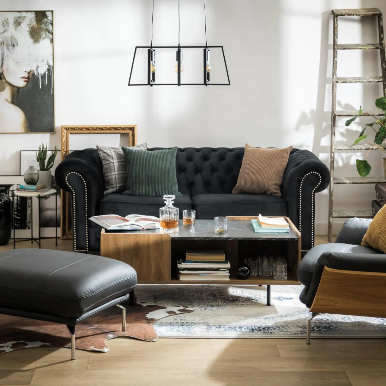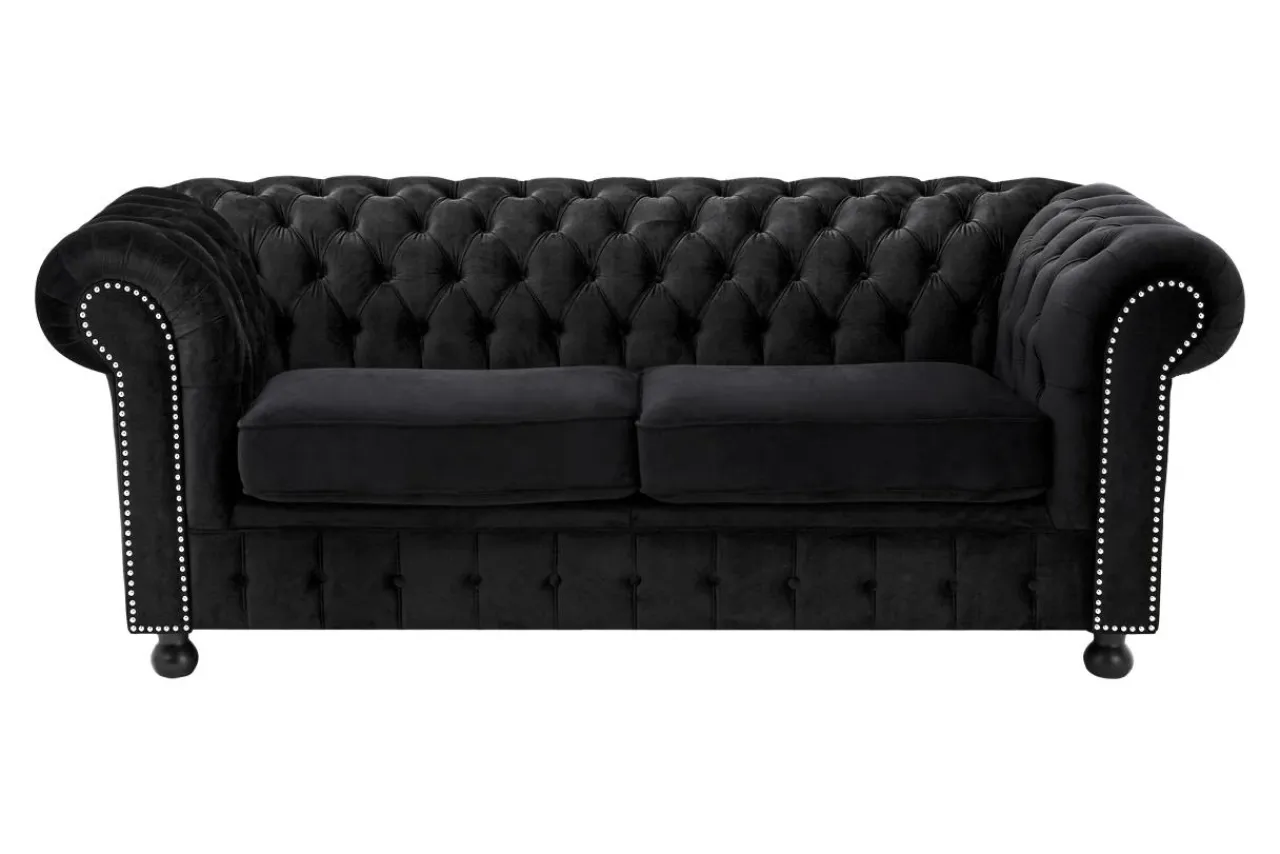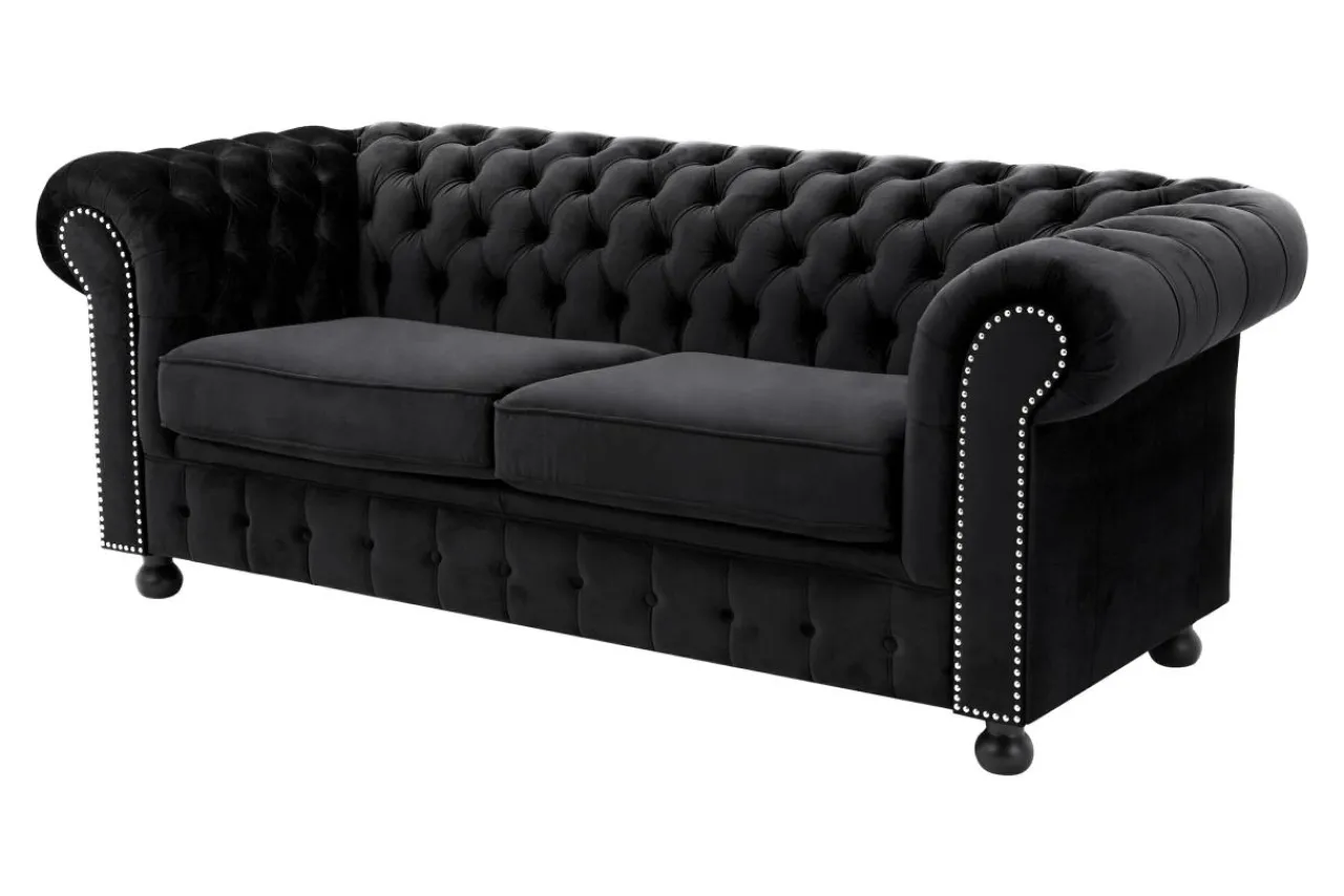 - Sofę CHESTER charakteryzuje pikowanie na oparciu oraz srebrne ćwieki zdobiące front podłokietników.