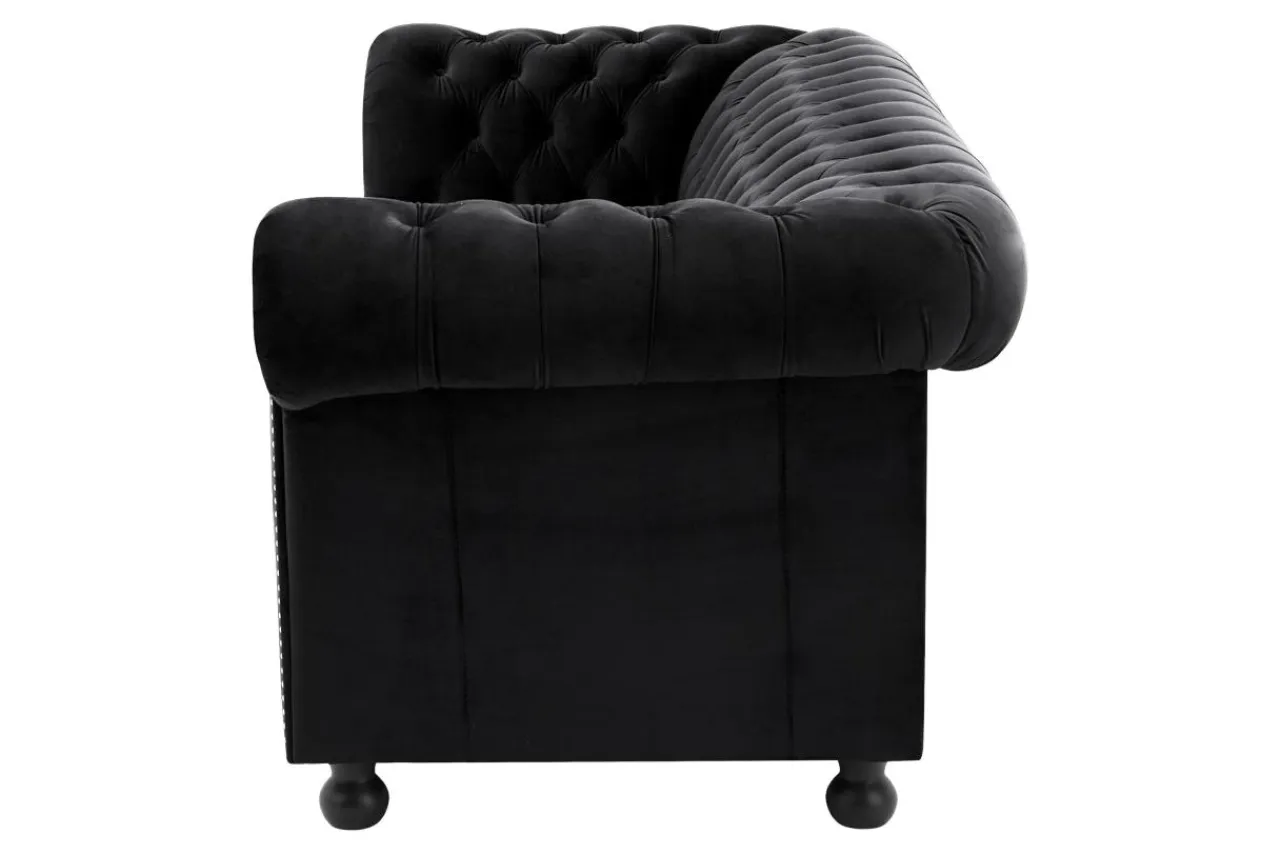- Czarny welurowy materiał oraz drewniane nóżki w kształcie kul dodają jej elegancji.