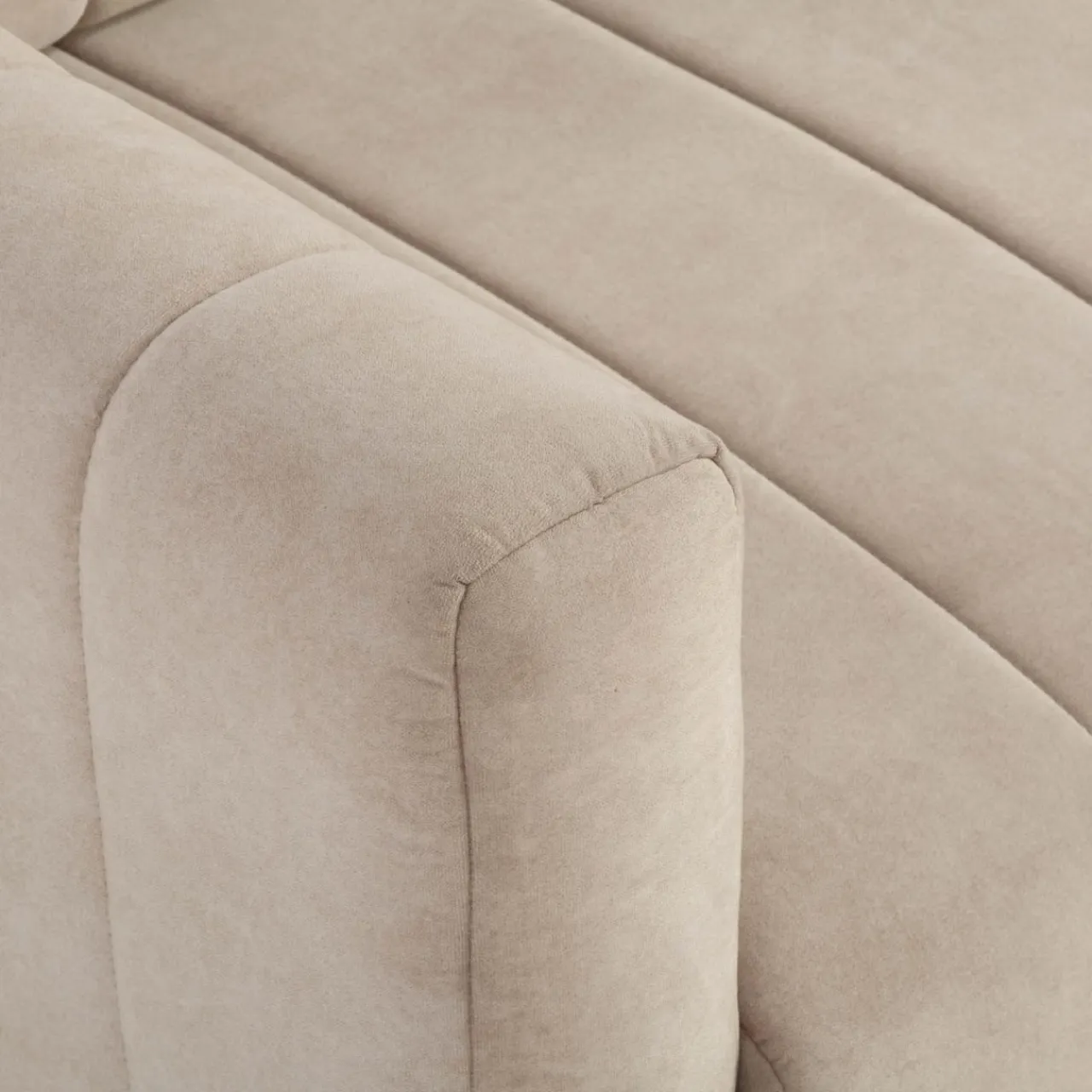 Mebel wyróżniają metalowe, ukośne nóżki oraz pionowe przeszycia zdobiące oparcie, siedzisko i wysokie podłokietniki.