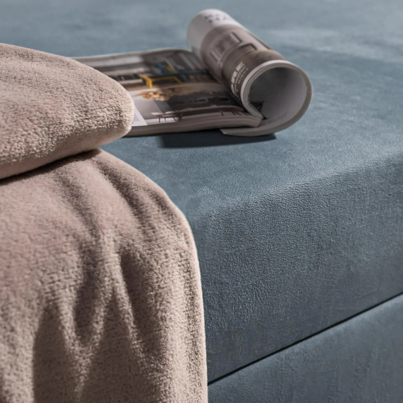 - Miękki welur w niebieskim odcieniu wpisze się w wystrój pokoju młodzieżowego.