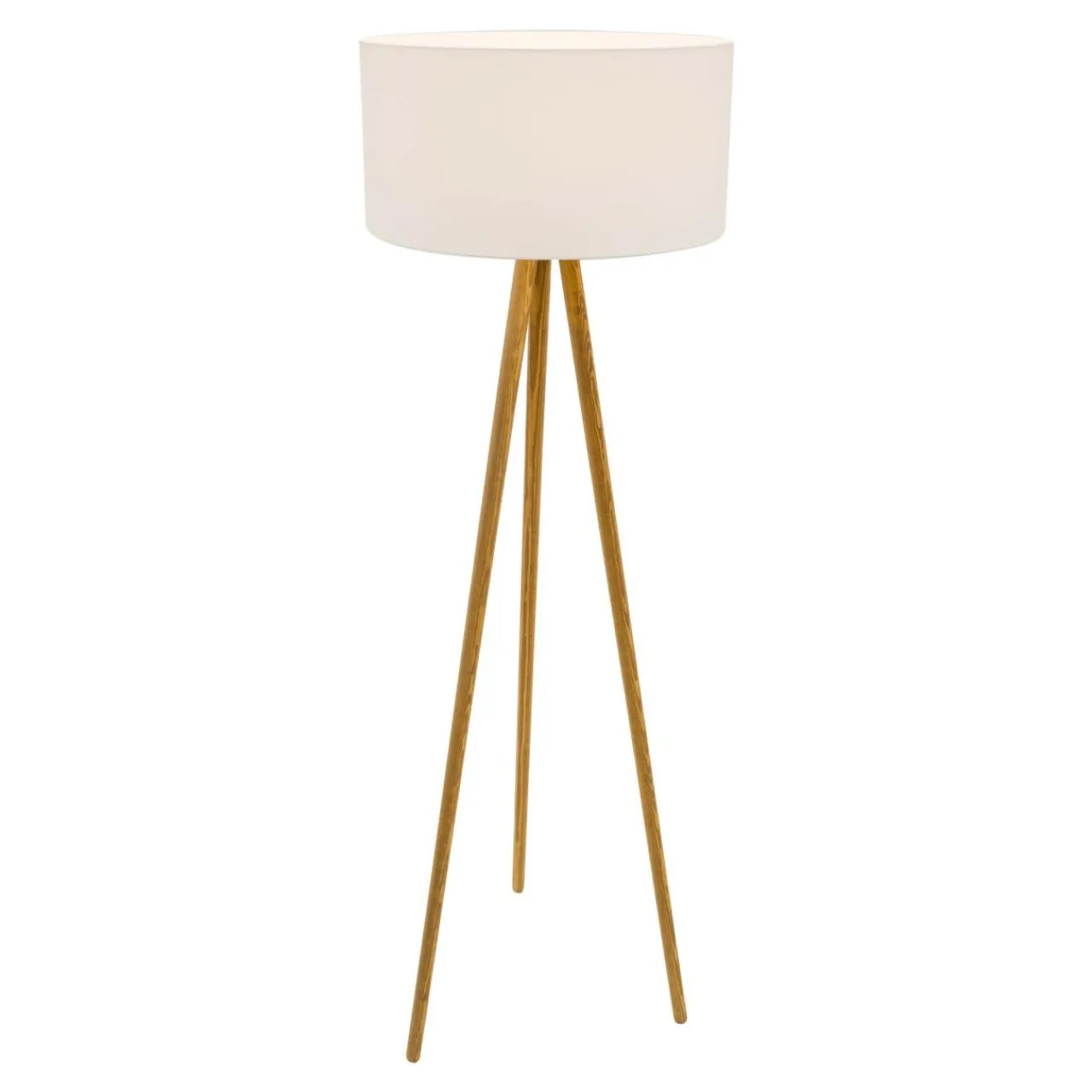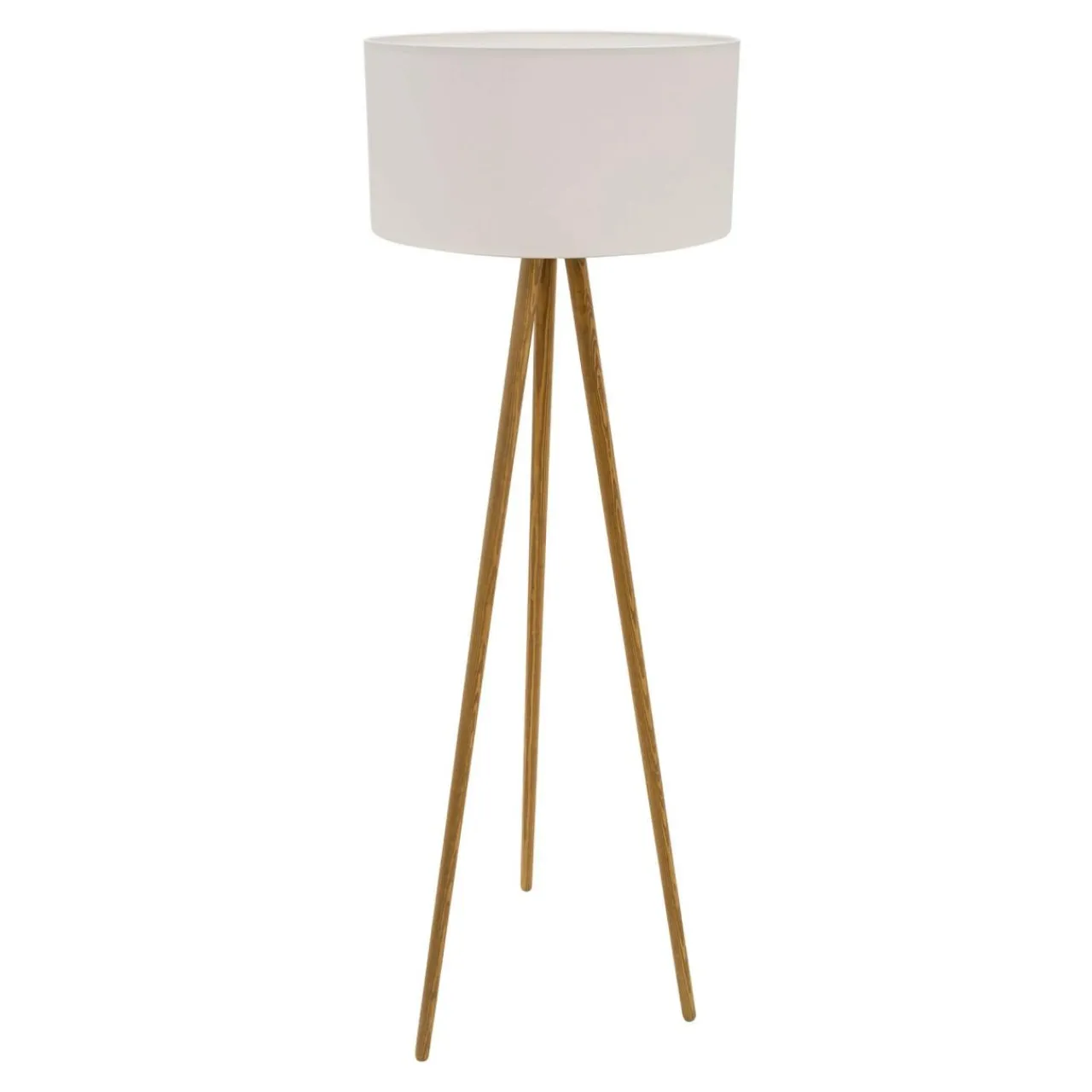Górną część lampy zdobi abażur w kształcie szerokiego walca o średnicy 50 cm, wykonany z tkaniny o białym kolorze.