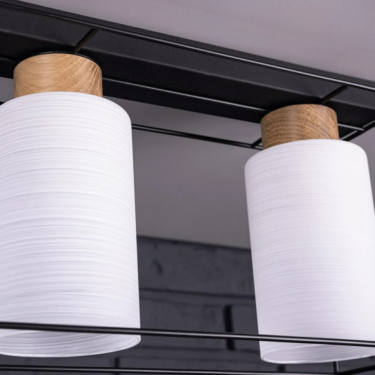 - Charakterystyczny design – geometryczna podstawa obramowana metalową osłoną ciekawie komponuje się z białymi kloszami, których surowy wygląd został lekko przełamany przez elementy ozdobne z jasnego drewna.
