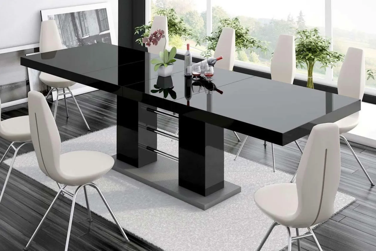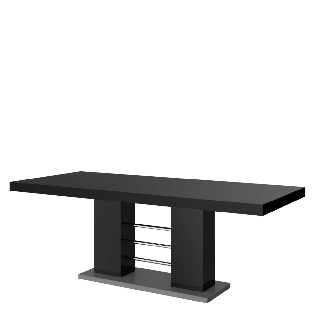 Rozkładany stół, na bardzo ciekawej kolumnowej podstawie, pozwoli ci stworzyć stylowe wnętrze. Wykonanie w czarnym kolorze na wysoki połysk nada każdemu pomieszczeniu nowoczesności, a jasnym aranżacjom mocnego akcentu. Funkcjonalna podstawa umożliwi wygodne zajęcie miejsca przy stole. Ozdobne chromowane rurki, które łączą dwie kolumny podstawy, dodają elegancji i wyjątkowego charakteru.