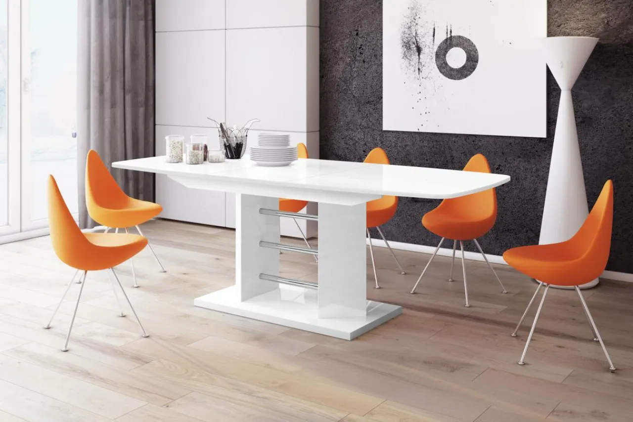 Stół w razie potrzeby można rozszerzyć ze 160 do 256 cm. Całkowicie biała kolorystyka rozjaśnia optycznie pomieszczenie. Blat stołu jest lekko zaokrąglony co zwiększa bezpieczeństwo użytkowania.