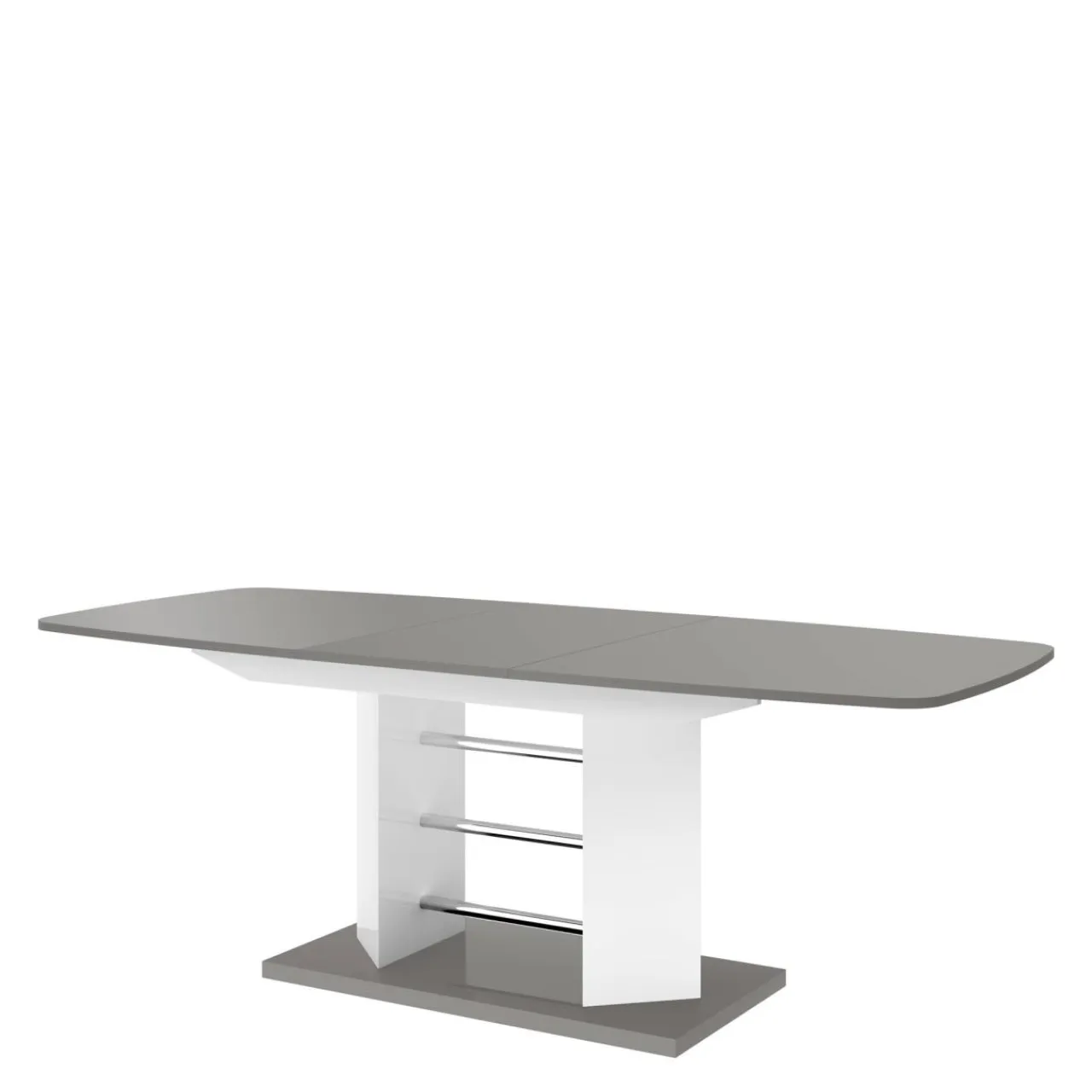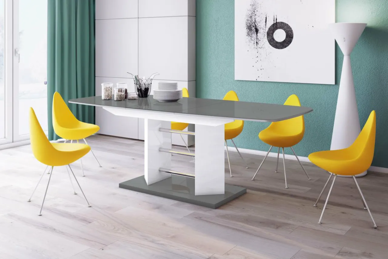 Stół w razie potrzeby można rozszerzyć ze 160 do 256 cm. Białe nogi stołu łączą się z kolorem szarym podstawy i blatu. Blat stołu jest lekko zaokrąglony co zwiększa bezpieczeństwo użytkowania.
