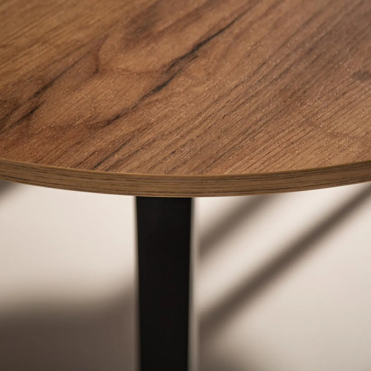 Blat stołu wykończono w kolorze złotego dębu craft a nogi w modnej czerni – takie połączenie sprawdzi się w pomieszczeniach urządzonych w stylu retro.