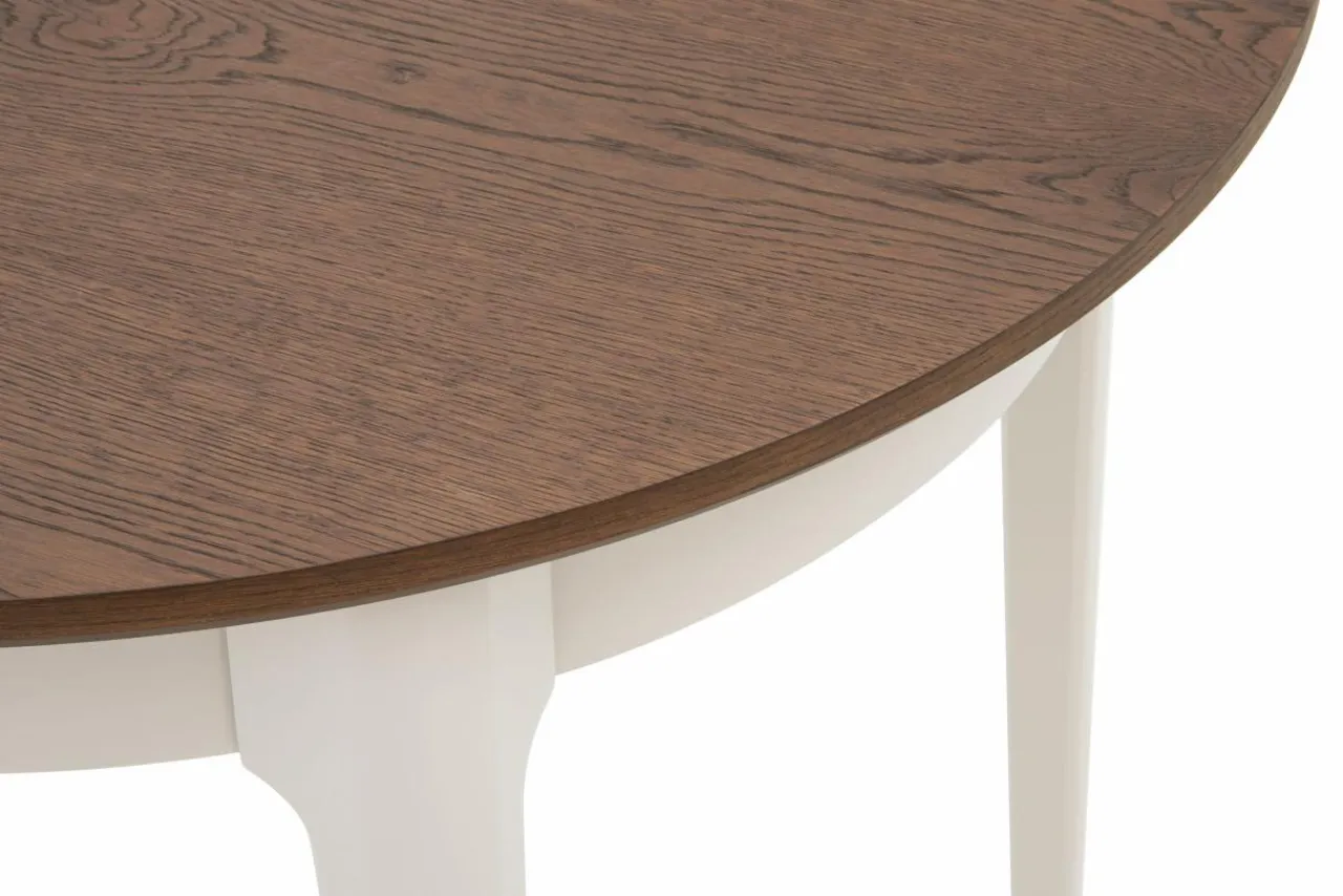 Stół wykonany jest z płyty MDF, pokryty dębową okleiną i wykończony matowym lakierem. Posiada blat w kolorze ciemnego drewna, który kontrastuje z jasnymi nogami, nadając mu eleganckiego charakteru.