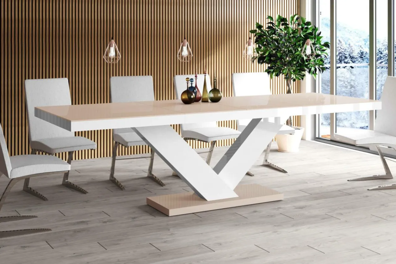 - Stół rozkłada się niezwykle lekko za pomocą prowadnicy synchronicznej – wystarczy rozsunąć jedną część blatu, druga zacznie rozkładać się równolegle.