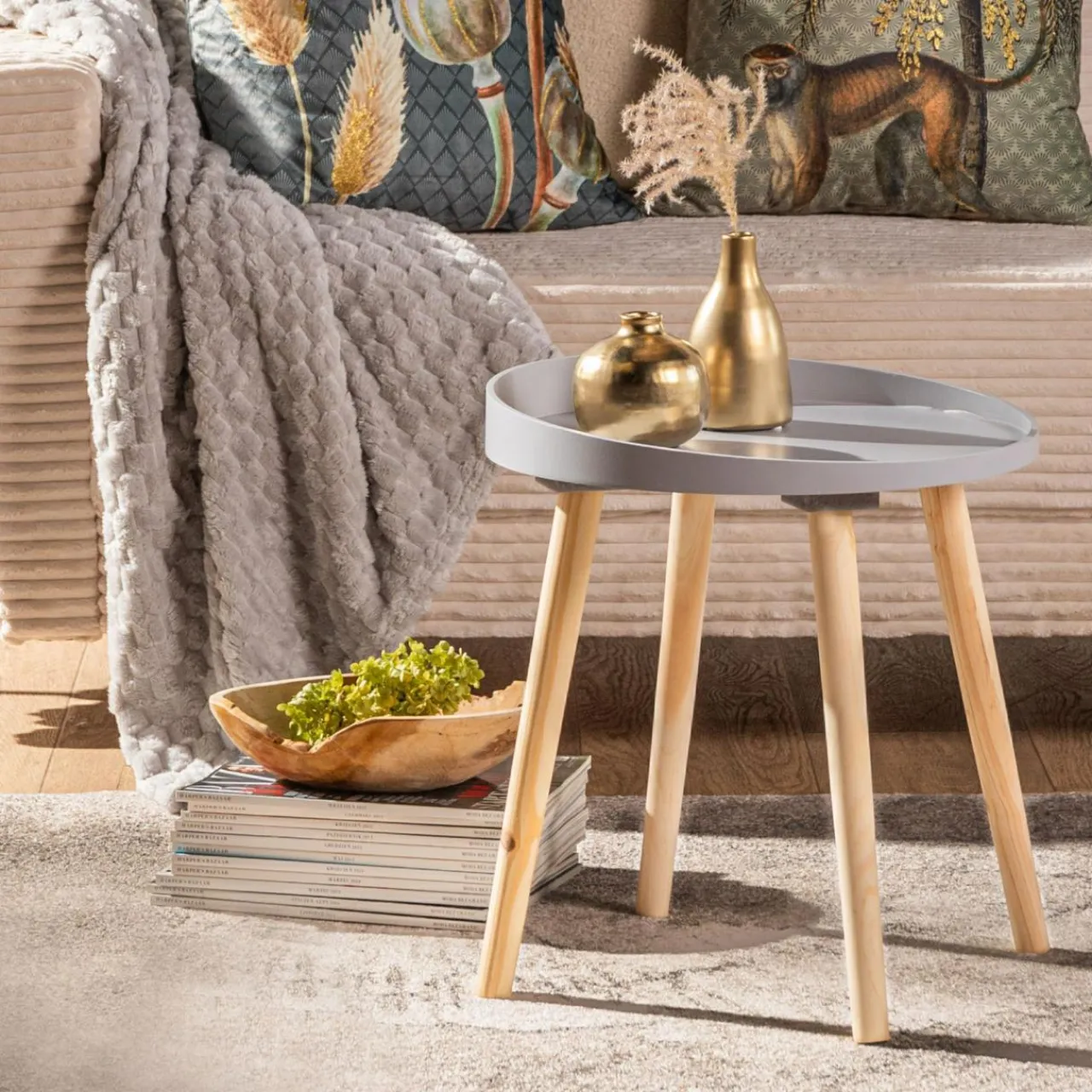 Wykonany z MDF blat został pomalowany na kolor Matt Grey (PANTONE 14-4105TPG). Nogi wyprodukowano z drewna sosnowego w naturalnym kolorze.