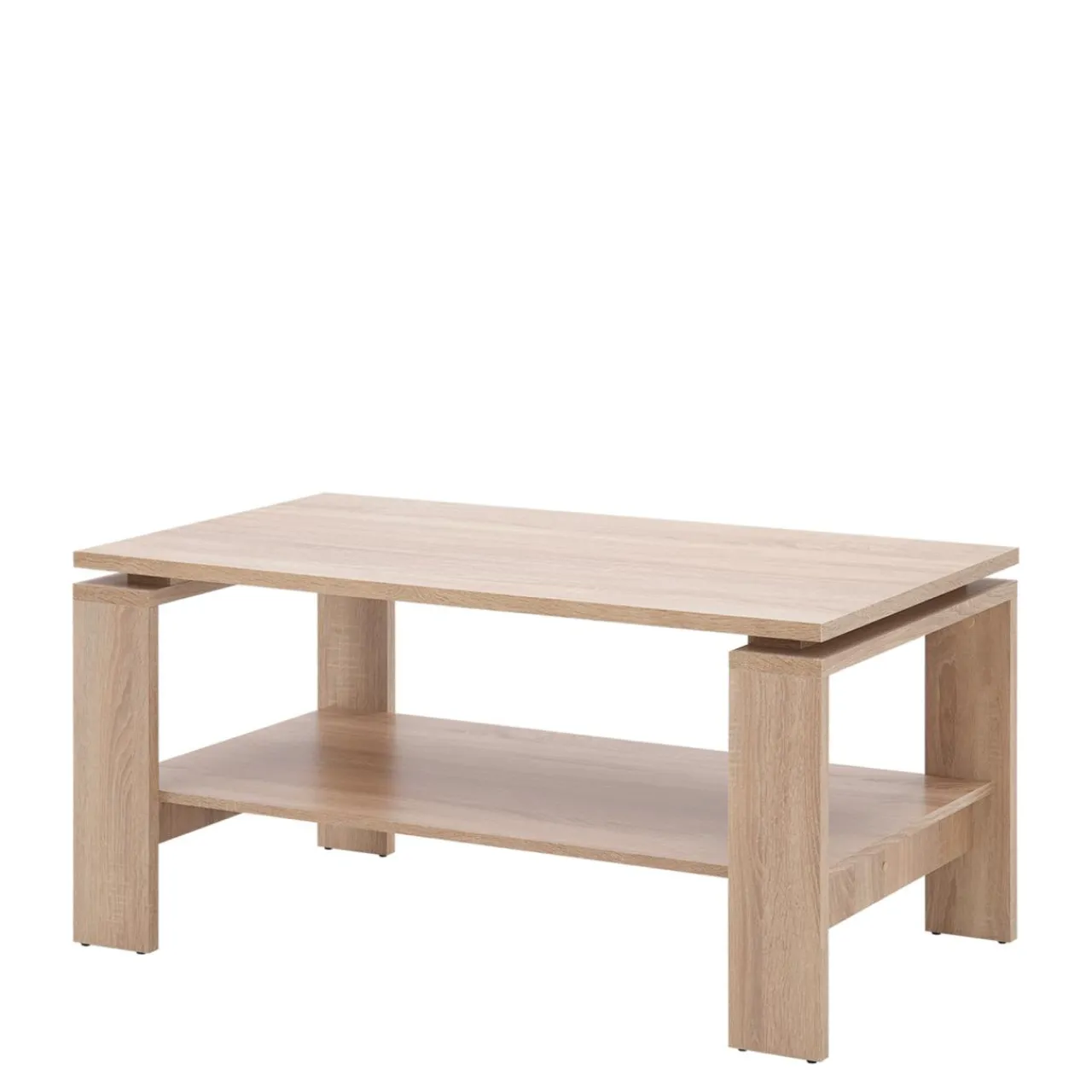 - Blat mebla wykonano z płyty wiórowej i pokryto folią w kolorze dąb sonoma. Takie wykończenie pasuje do nowoczesnych pomieszczeń – urządzonych w stylu skandynawskim.