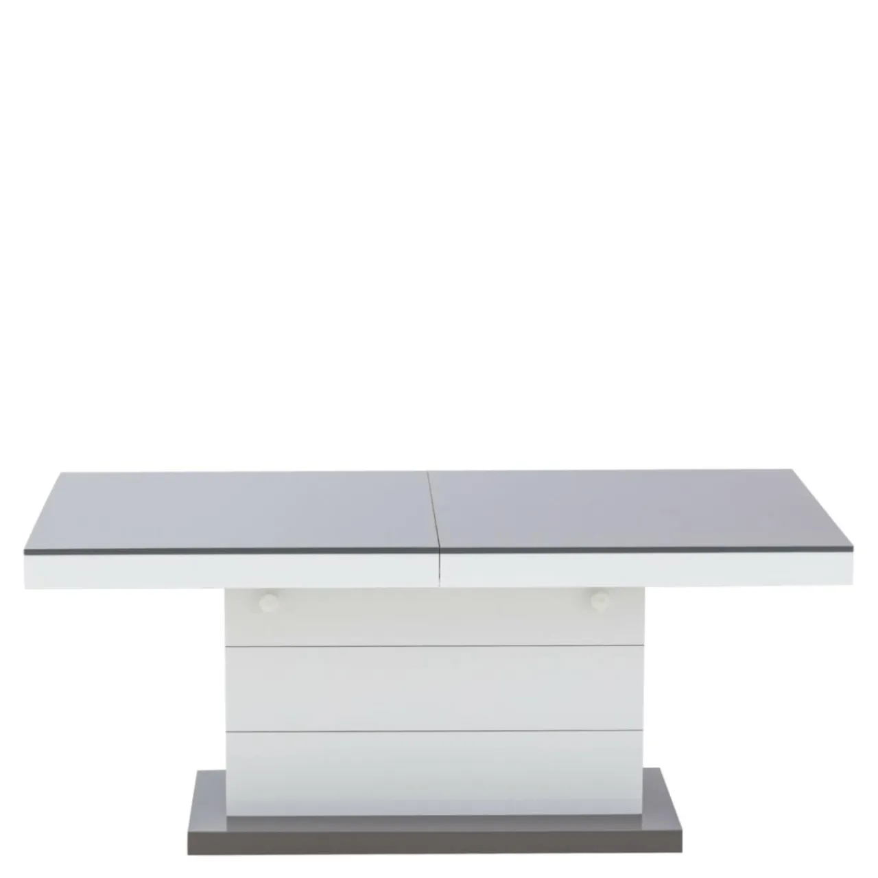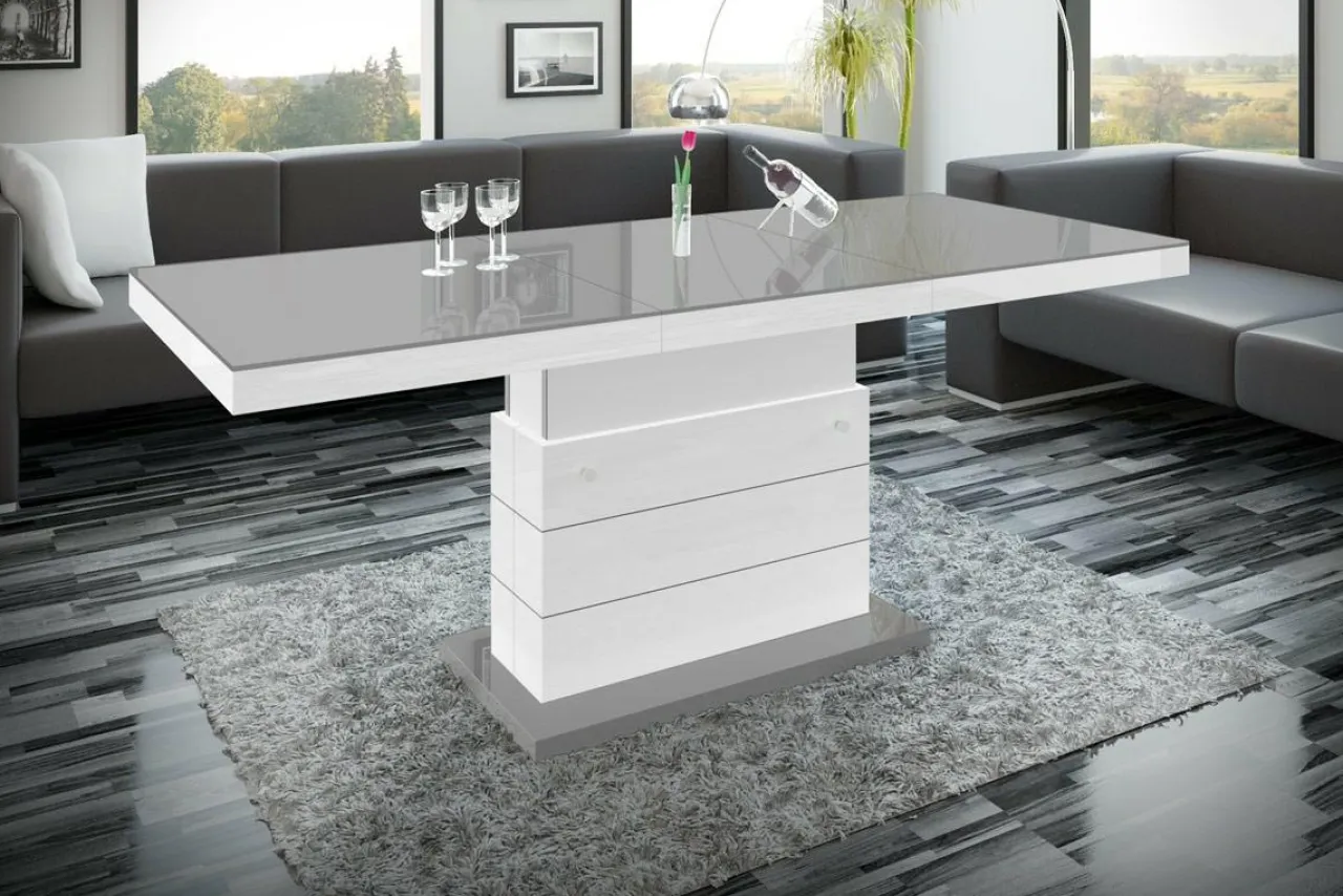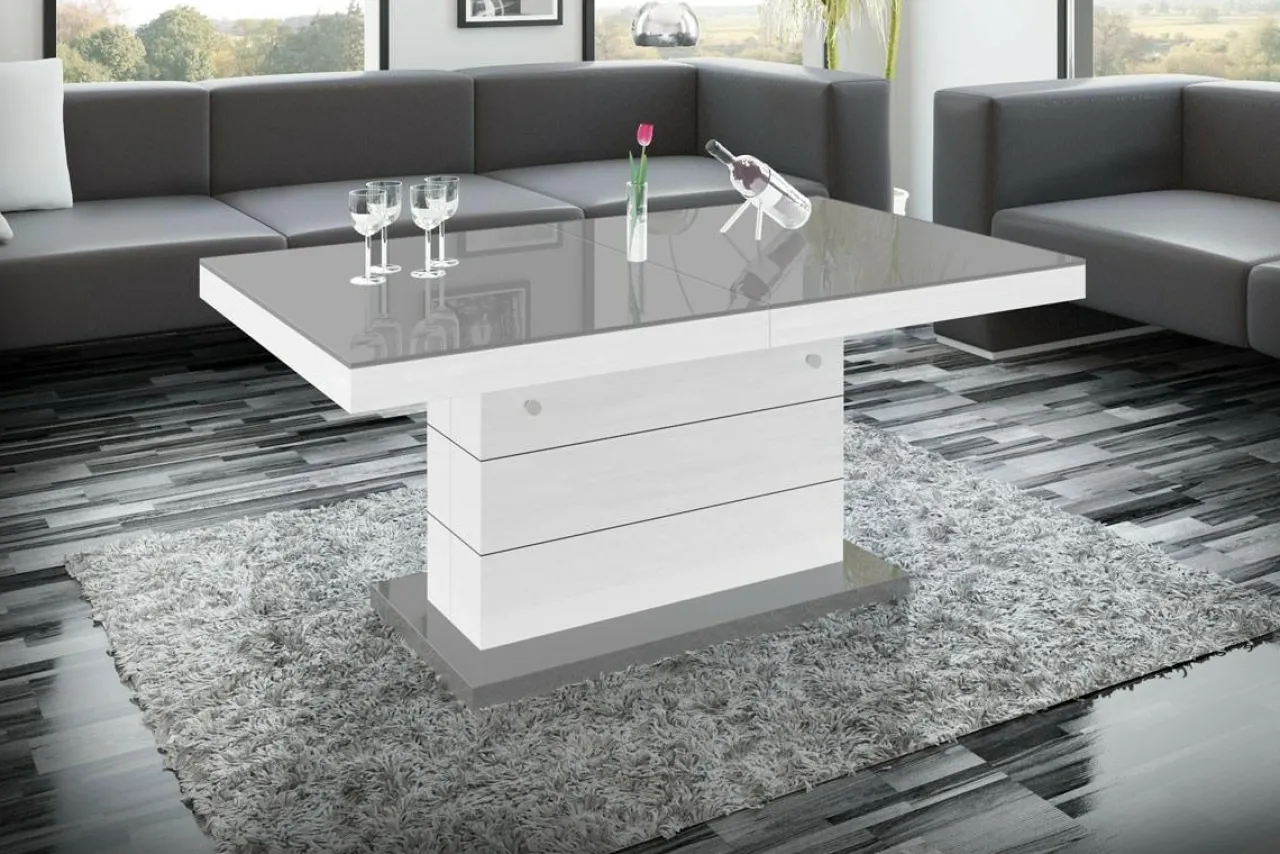 Podnoszona i rozkładana ława MATERA LUX to stylowy dodatek do salonu. W modnym połączeniu szarości z bielą, będzie pięknie prezentować się w salonie, ale też w biurze i innych przestrzeniach. Zamiast czterech nóg zastosowano stabilną podstawę z dekoracyjnymi, poziomymi nacięciami. Całość prezentuje się bardzo efektownie, z pewnością zachwyci twoich gości. Blat stolika ma efekt lustrzanej nawierzchni dzięki wykorzystaniu płyt wykończonych na wysoki połysk. Mebel dwa w jednym na pewno przyda się w niewielkich wnętrzach.