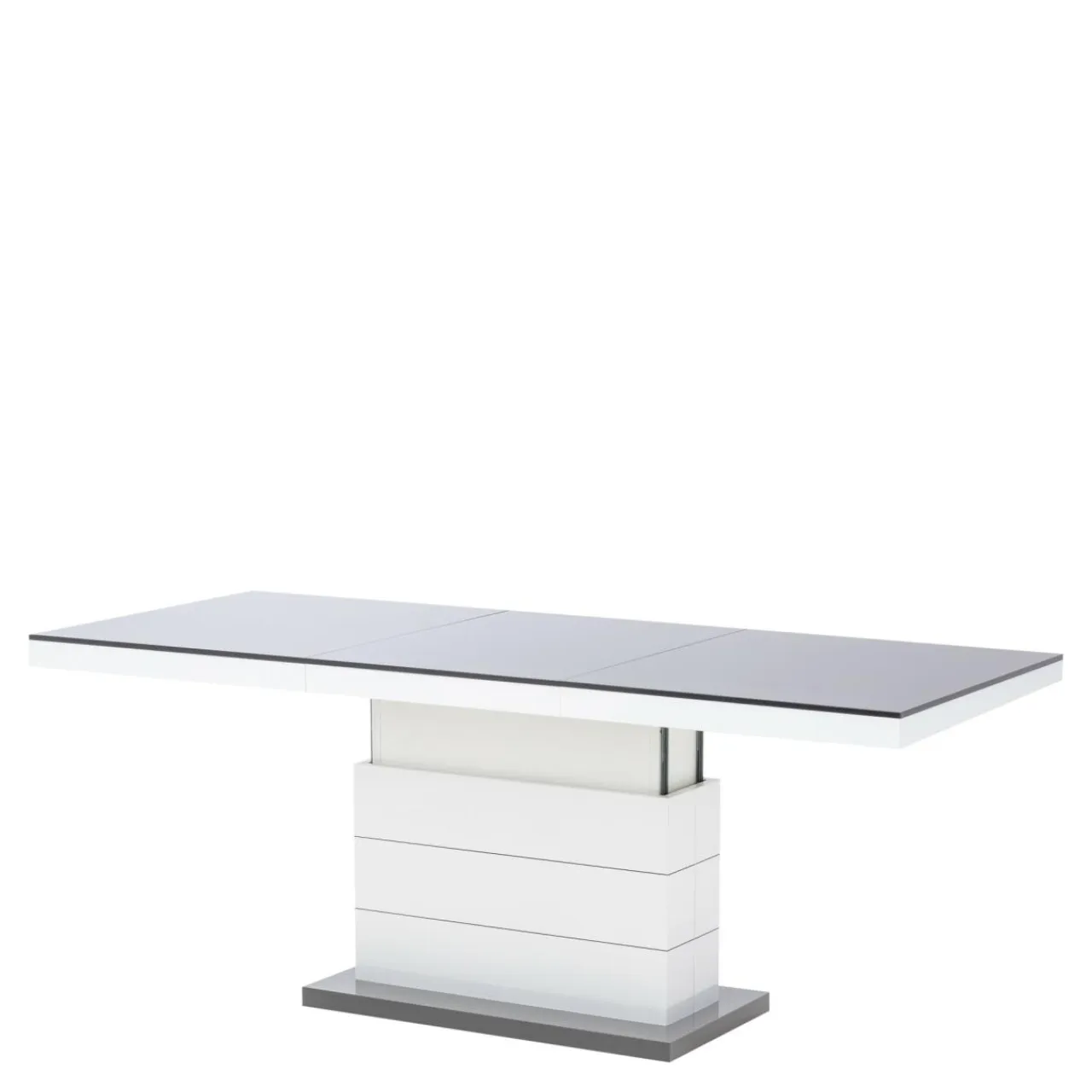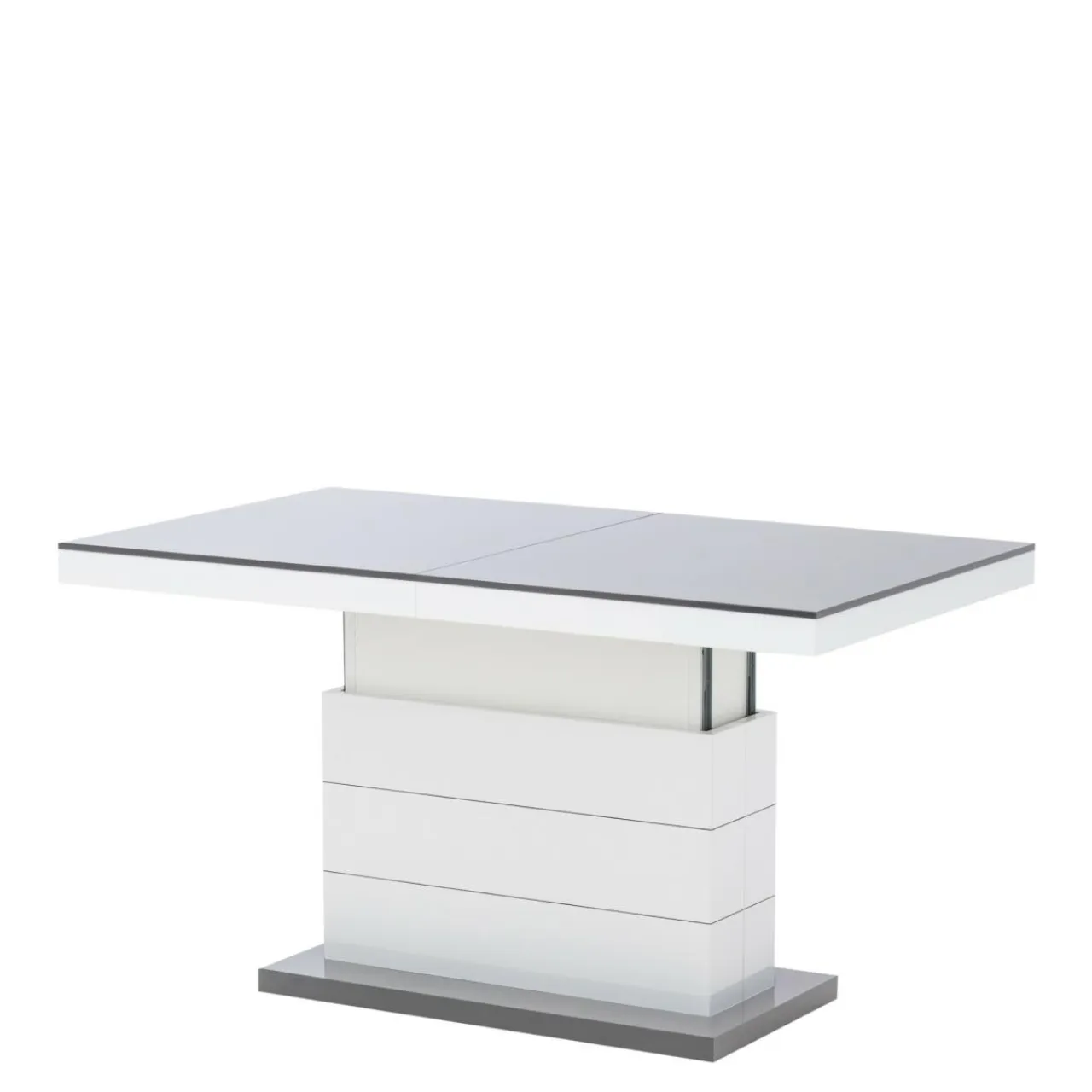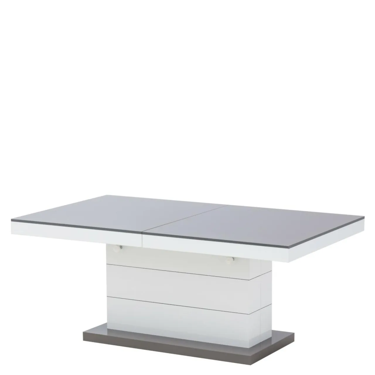 Podnoszona i rozkładana ława MATERA LUX to stylowy dodatek do salonu. W modnym połączeniu szarości z bielą, będzie pięknie prezentować się w salonie, ale też w biurze i innych przestrzeniach. Zamiast czterech nóg zastosowano stabilną podstawę z dekoracyjnymi, poziomymi nacięciami. Całość prezentuje się bardzo efektownie, z pewnością zachwyci twoich gości. Blat stolika ma efekt lustrzanej nawierzchni dzięki wykorzystaniu płyt wykończonych na wysoki połysk. Mebel dwa w jednym na pewno przyda się w niewielkich wnętrzach.