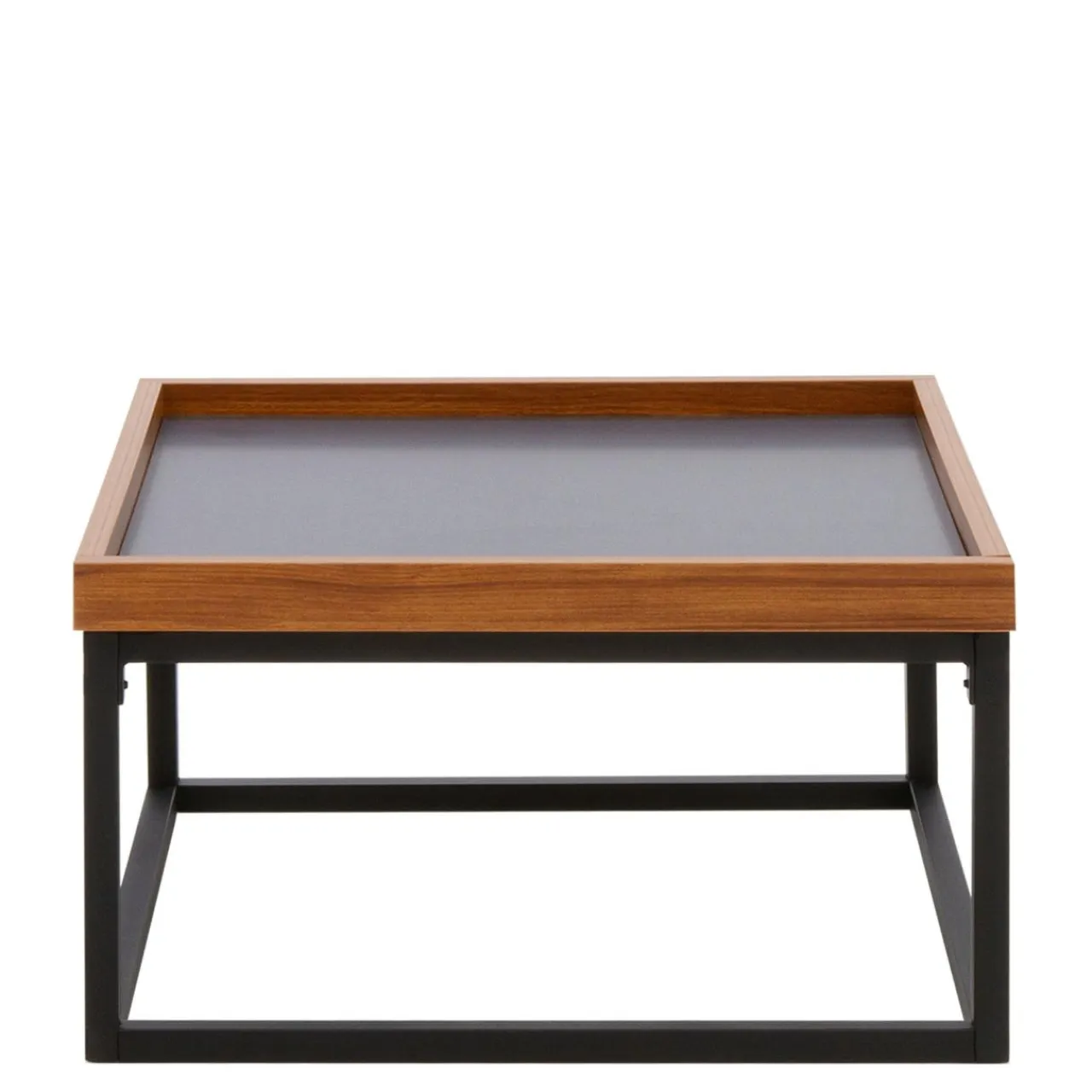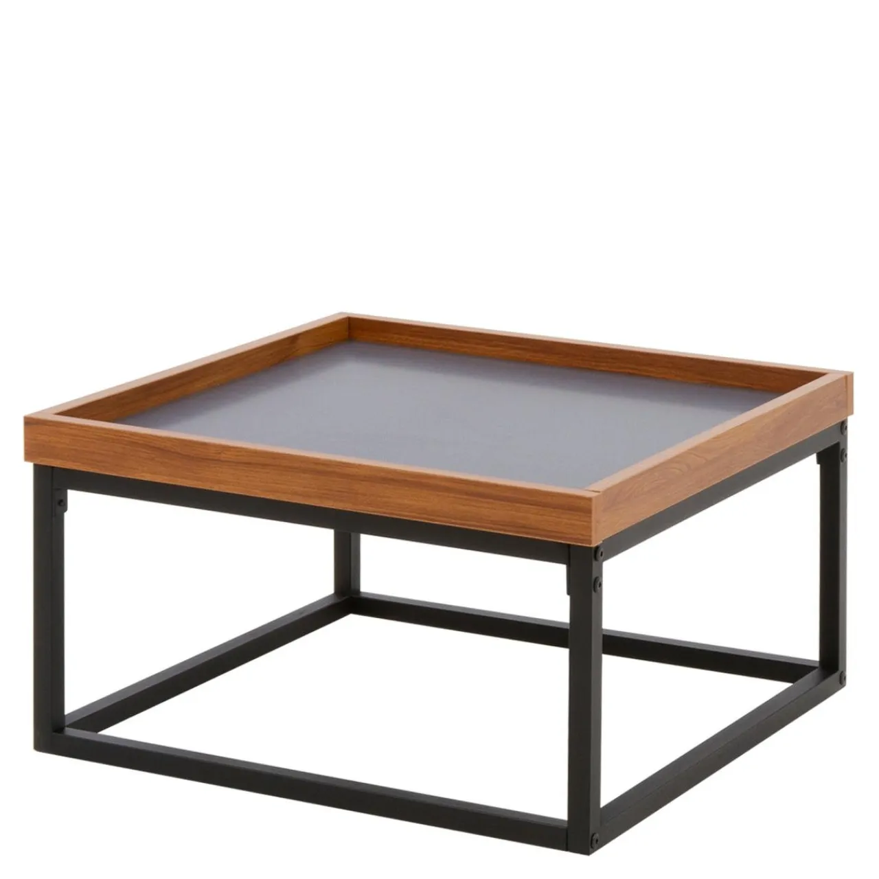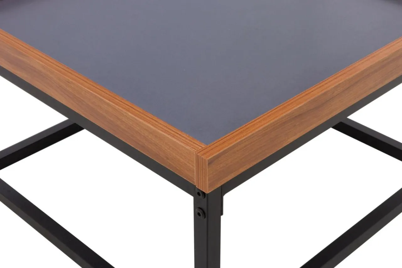 - Metalowa podstawa stolika stanowi doskonały punkt podparcia dla blatu z płyty wykończonego okleiną w ciemnoszarym kolorze